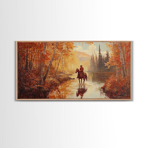 Black white cowboy riding toward snow-covered mountains, Framed Canvas Print, minimalist winter wall art, moody landscape, western decor