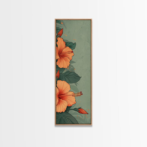Bright Hibiscus Flowers Ukiyo-e Inspired Art, Framed Canvas Print Ideal for Tall Skinny Spaces, Japanese Floral Design