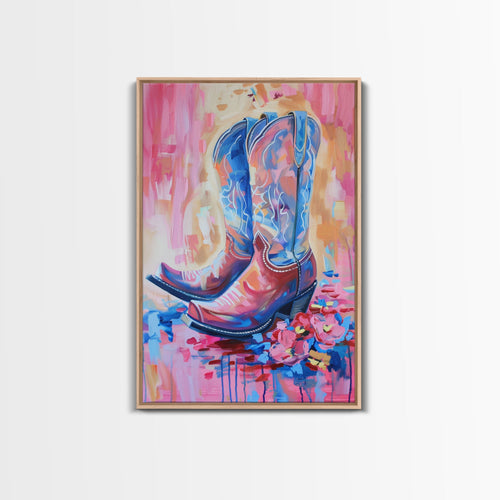 Bright Western Cowboy Boots Art with Floral Accents - Framed Canvas Print, Rustic Wall Art, Colorful Boot Decor for Living Room
