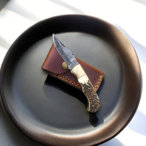 Folding Hunter Knife | Antler Horn Handle with Leather Case