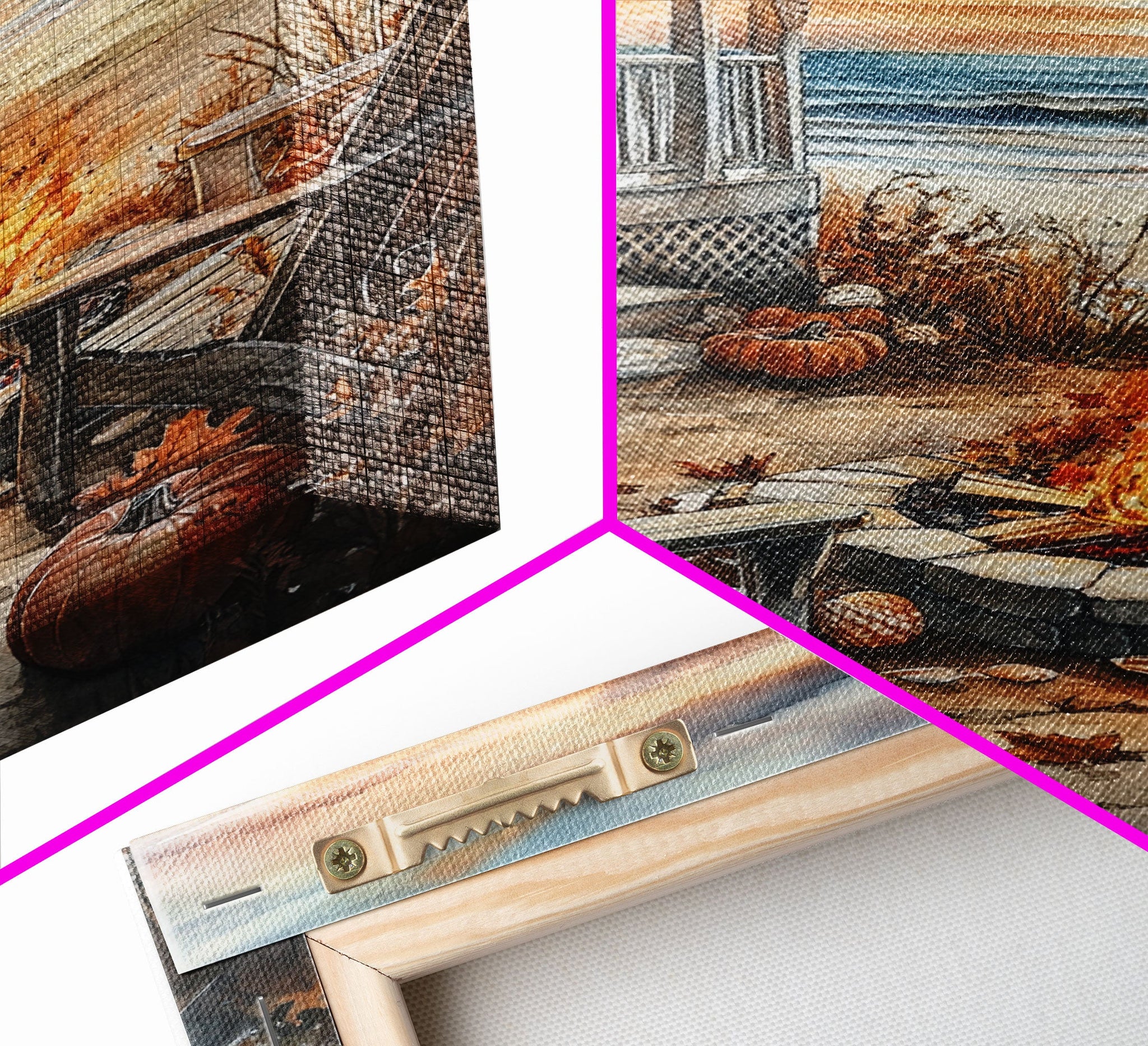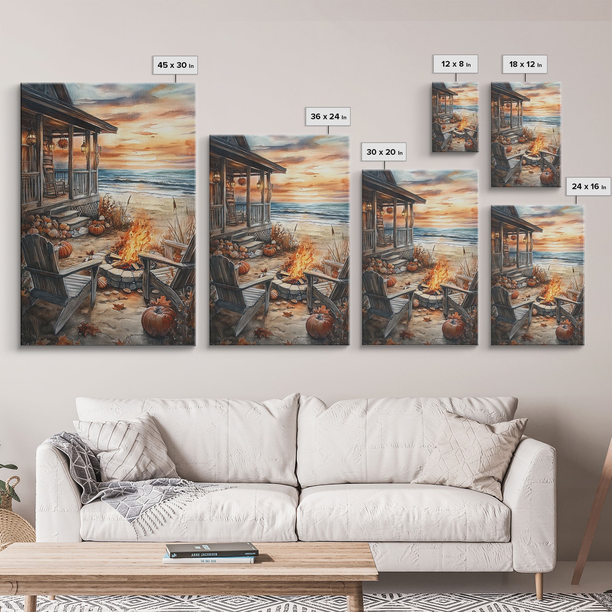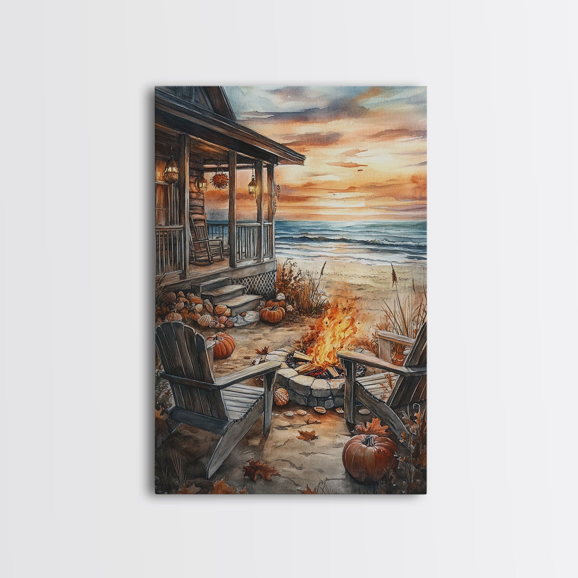 Beach Campfire On The Fall, Framed Canvas Print, Boho Beach Art Nautical Decor, Modern Christmas / Thanksgiving Gift Wall Art