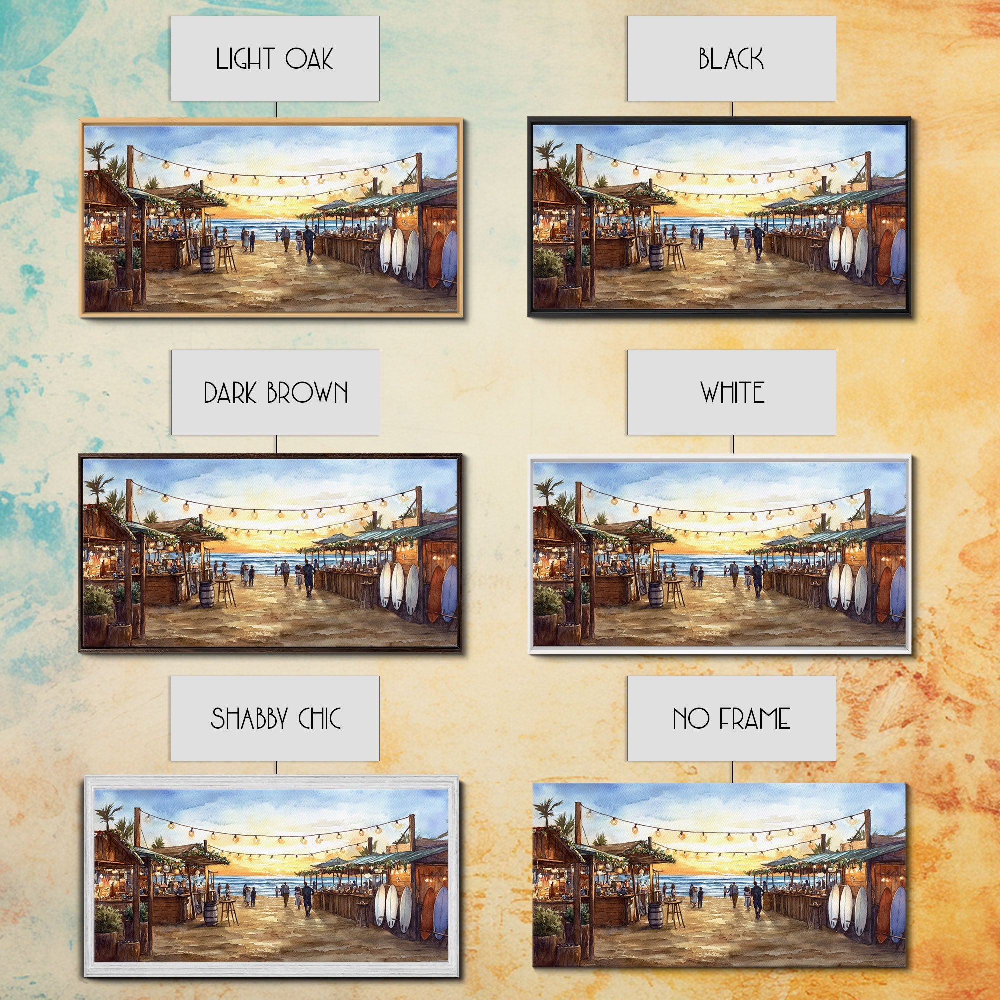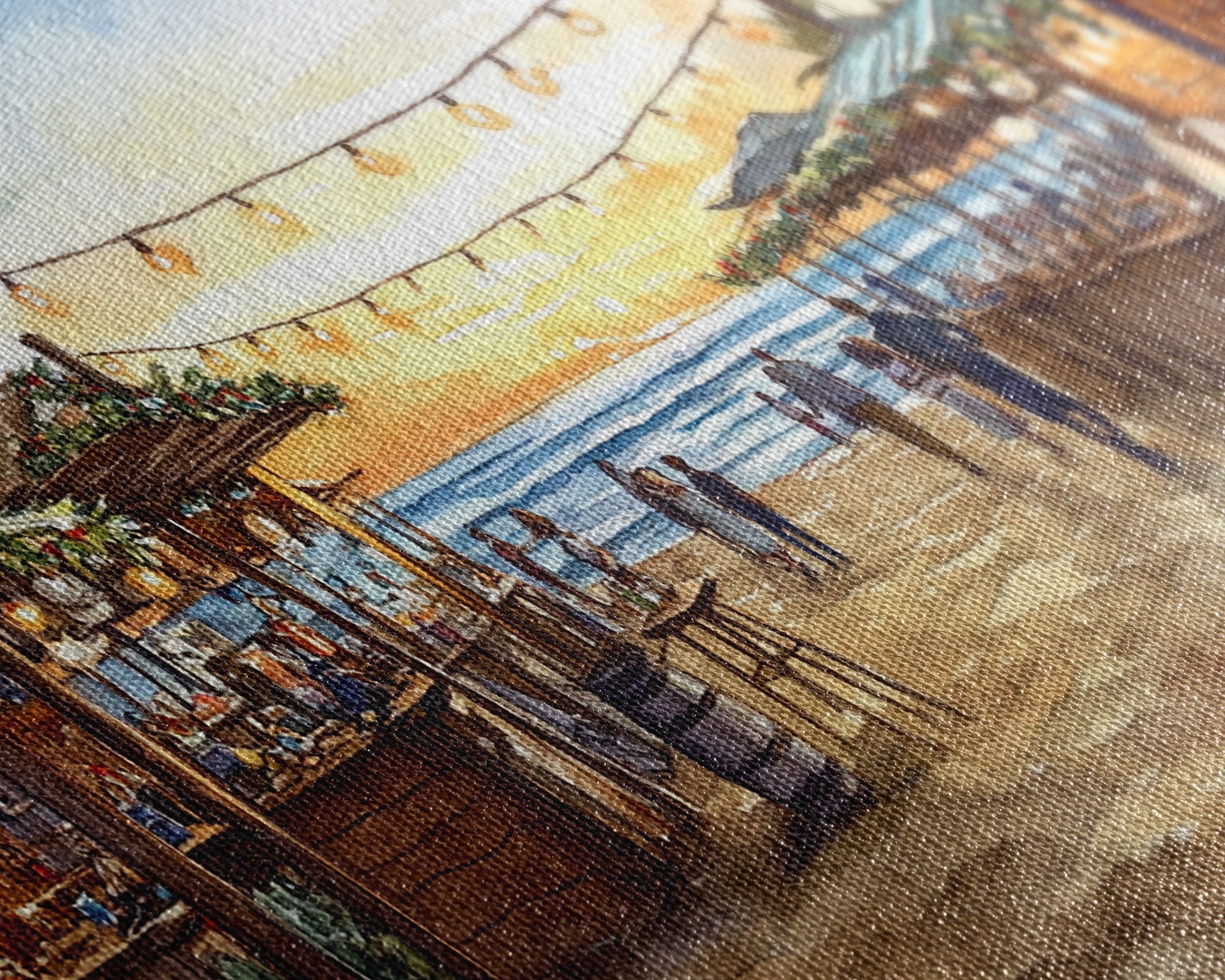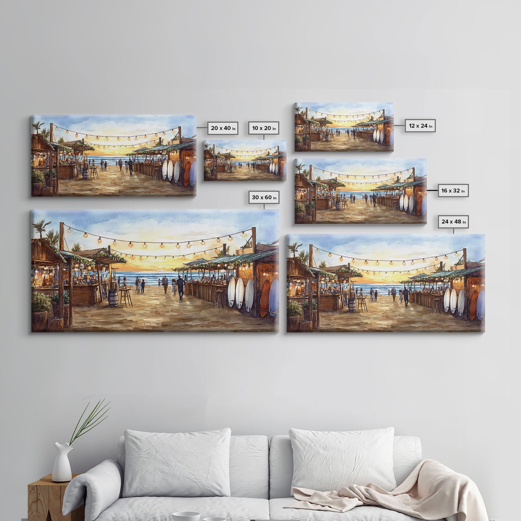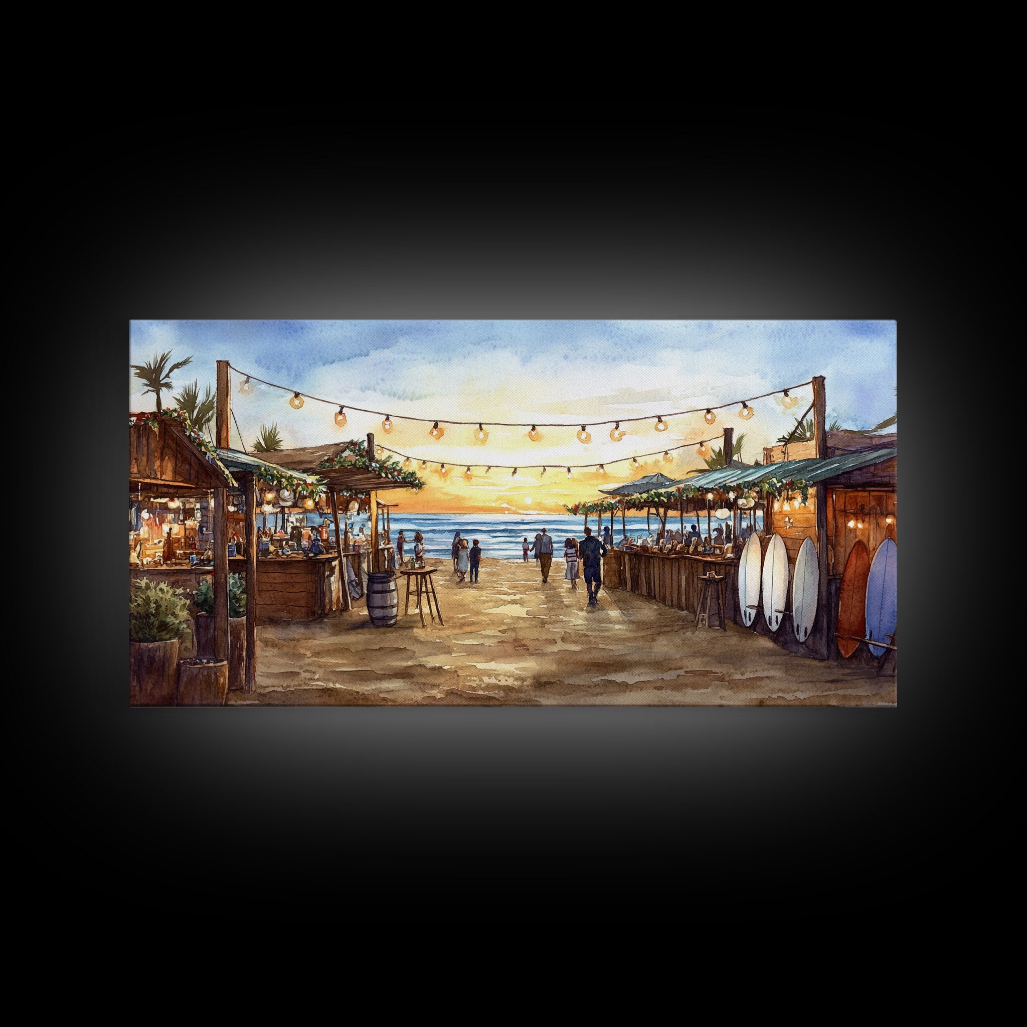 Beach Christmas Market Framed Canvas Print, Coastal Holiday Market Scene Wall Art, Christmas Decor Wall Art
