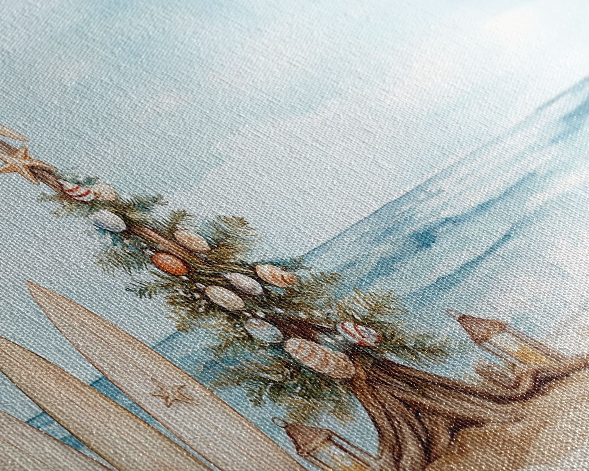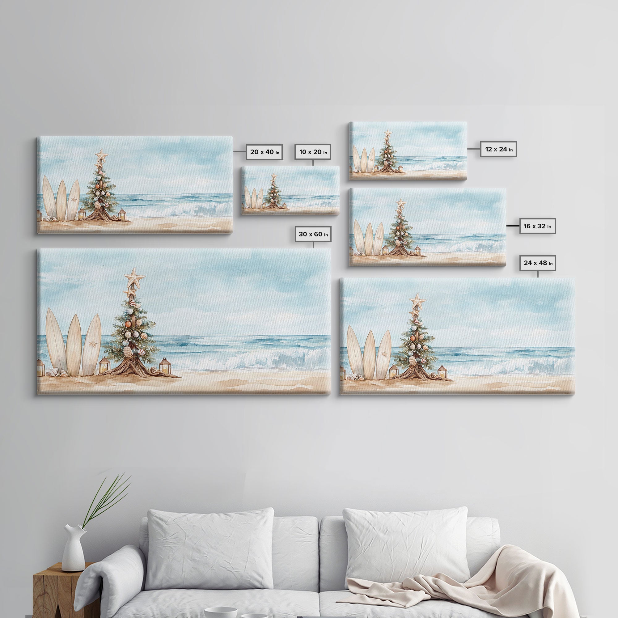 Beach Christmas scene with surfboards and decorated tree, tropical holiday art framed canvas print, perfect coastal seasonal decor
