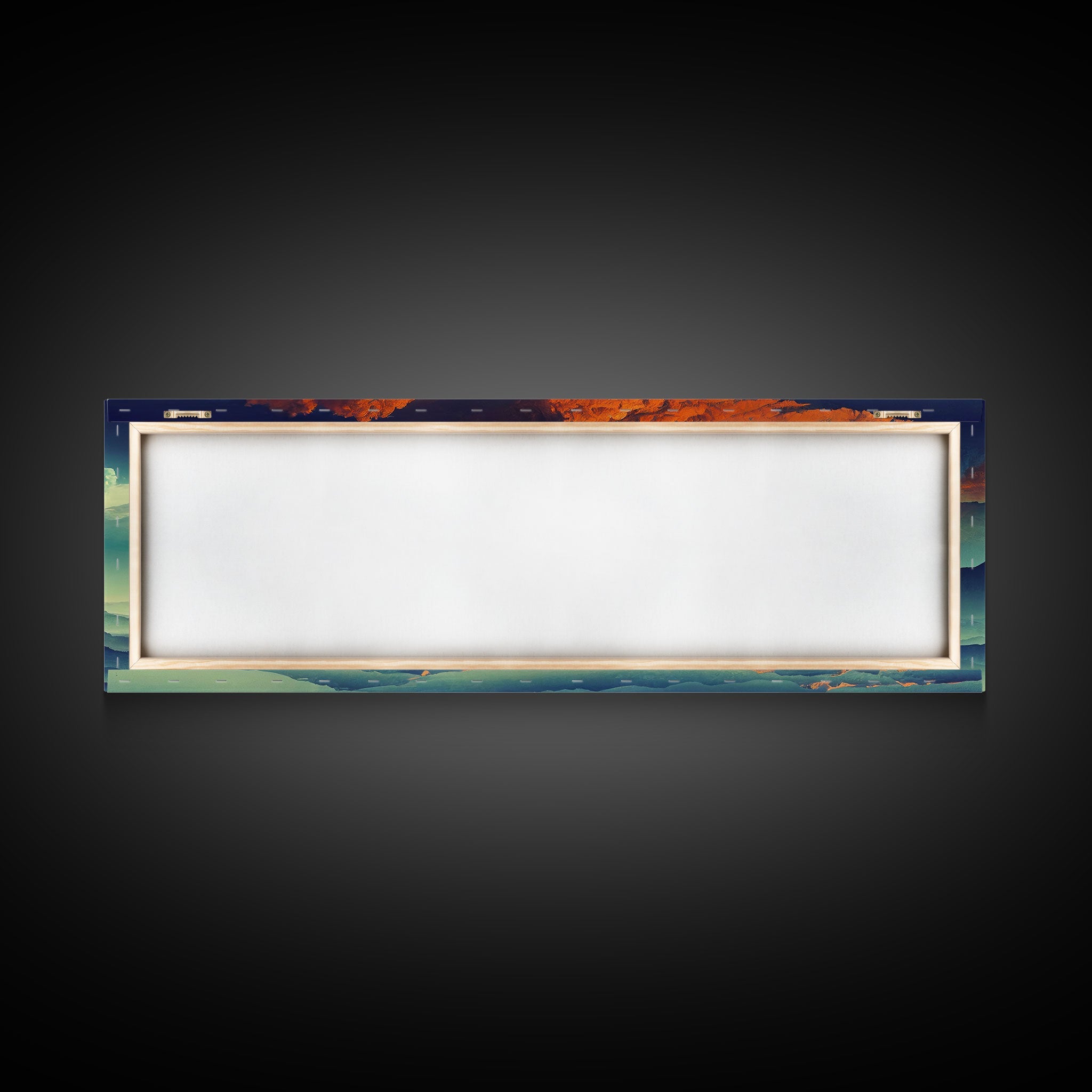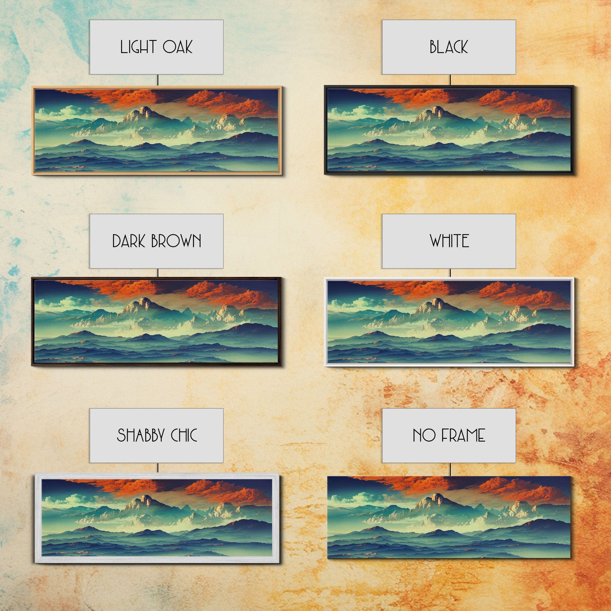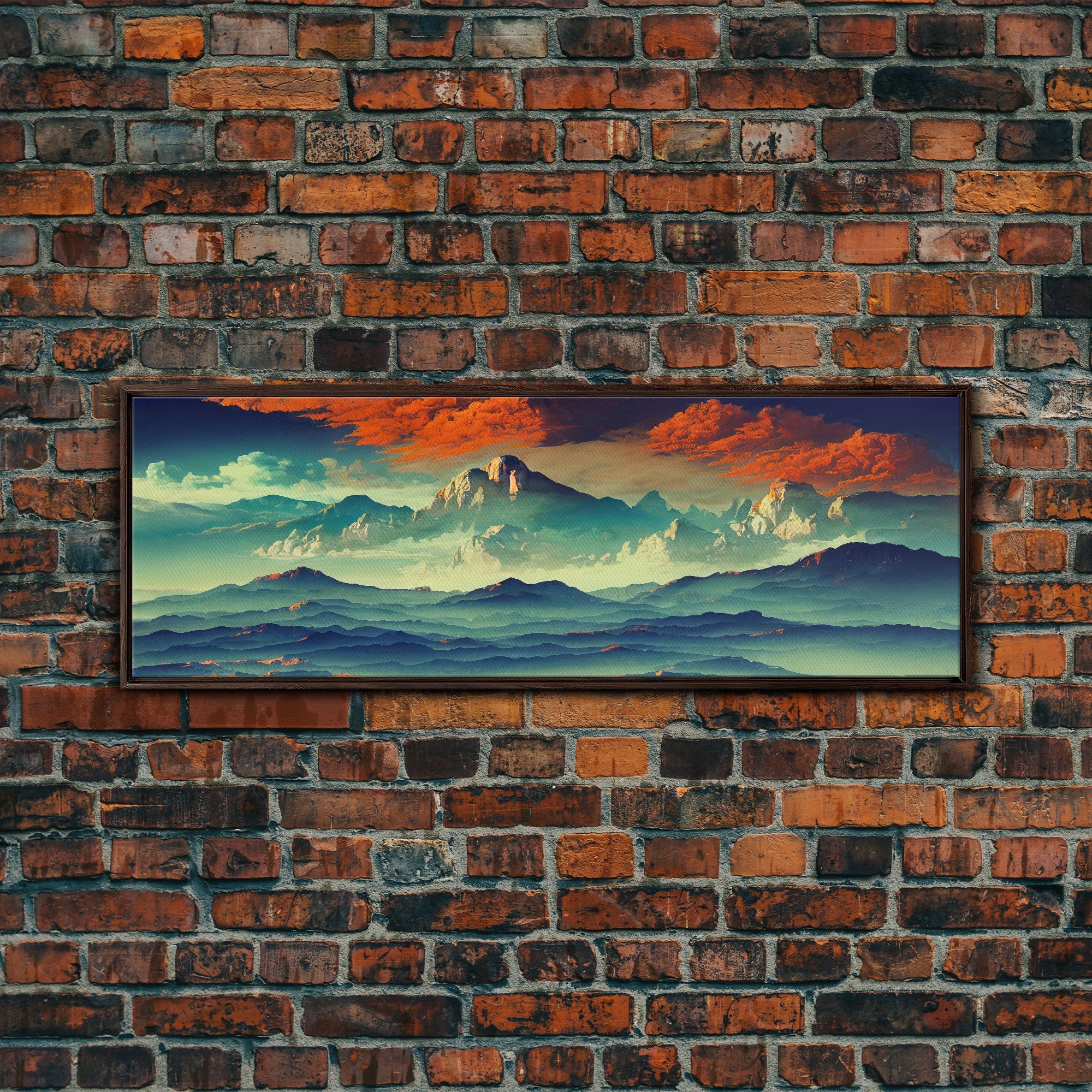 Beautiful Fantasy Mountain Landscape With Orange Clouds, Framed Canvas Print, Ready To Hang Panoramic Wall Decorr