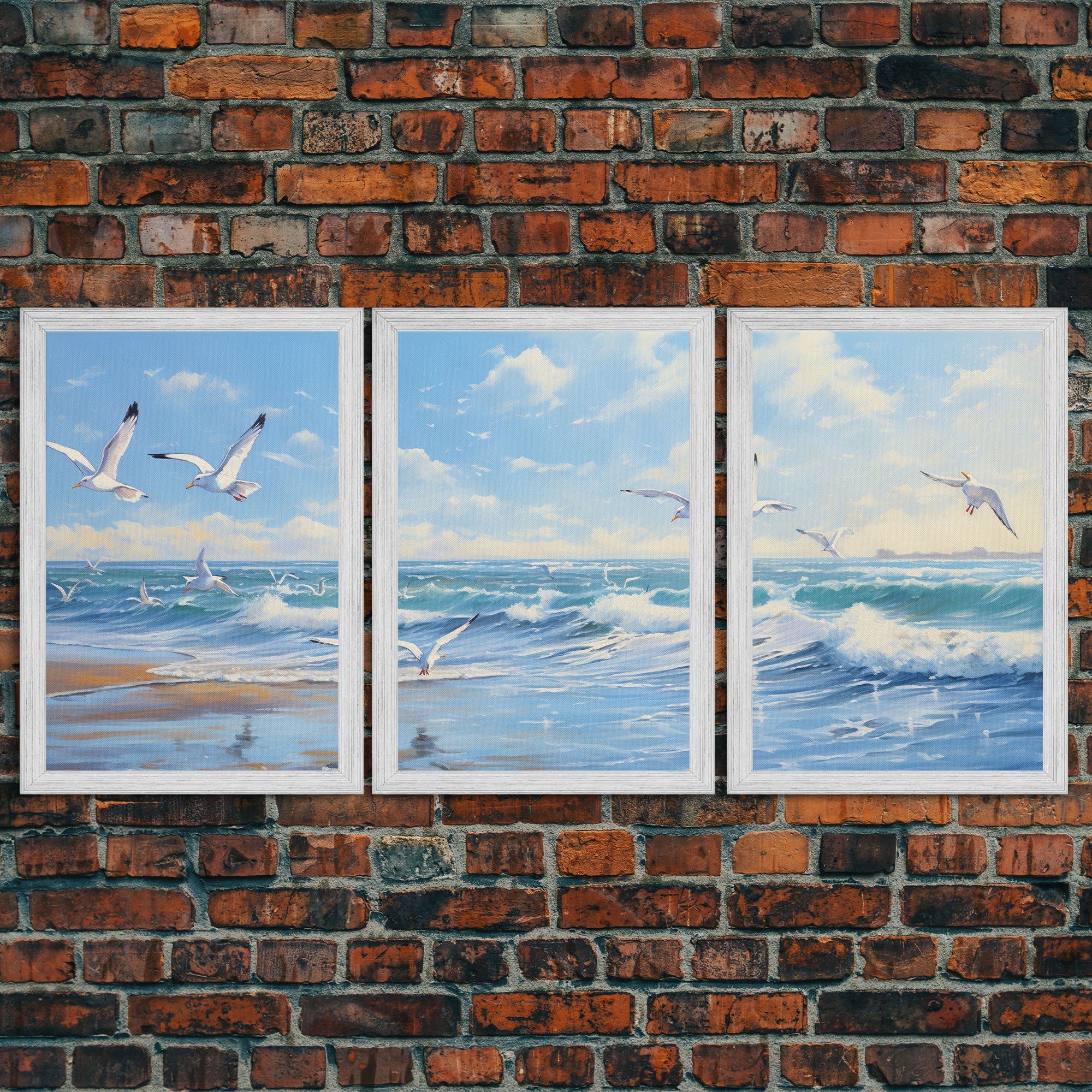 Beautiful Seagulls Over An Ocean Beach At Sunset 3 Piece Canvas Print Wall Art, Above Sofa Art, Modern Art, Minimalism Lakehouse Decor