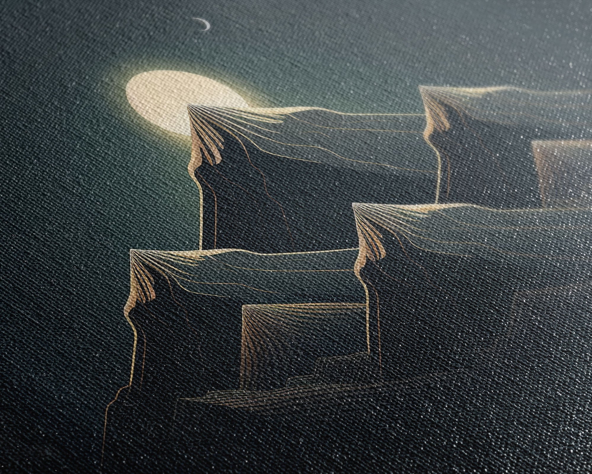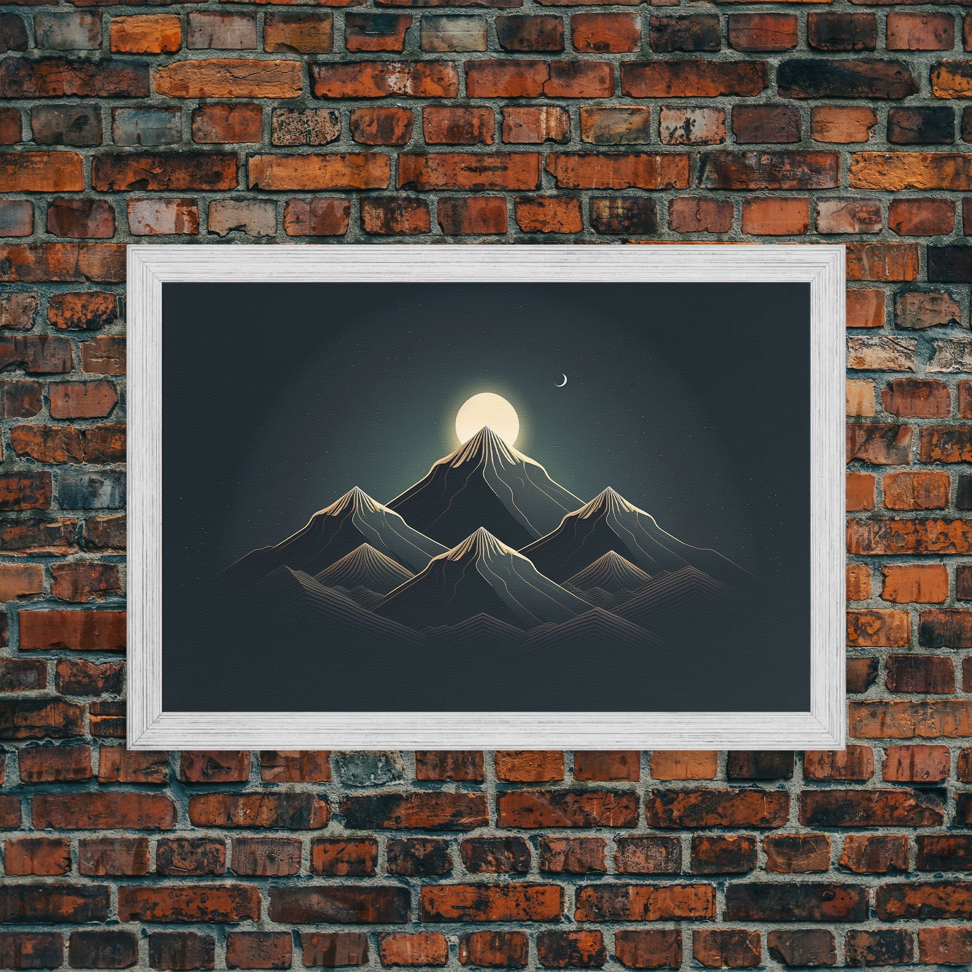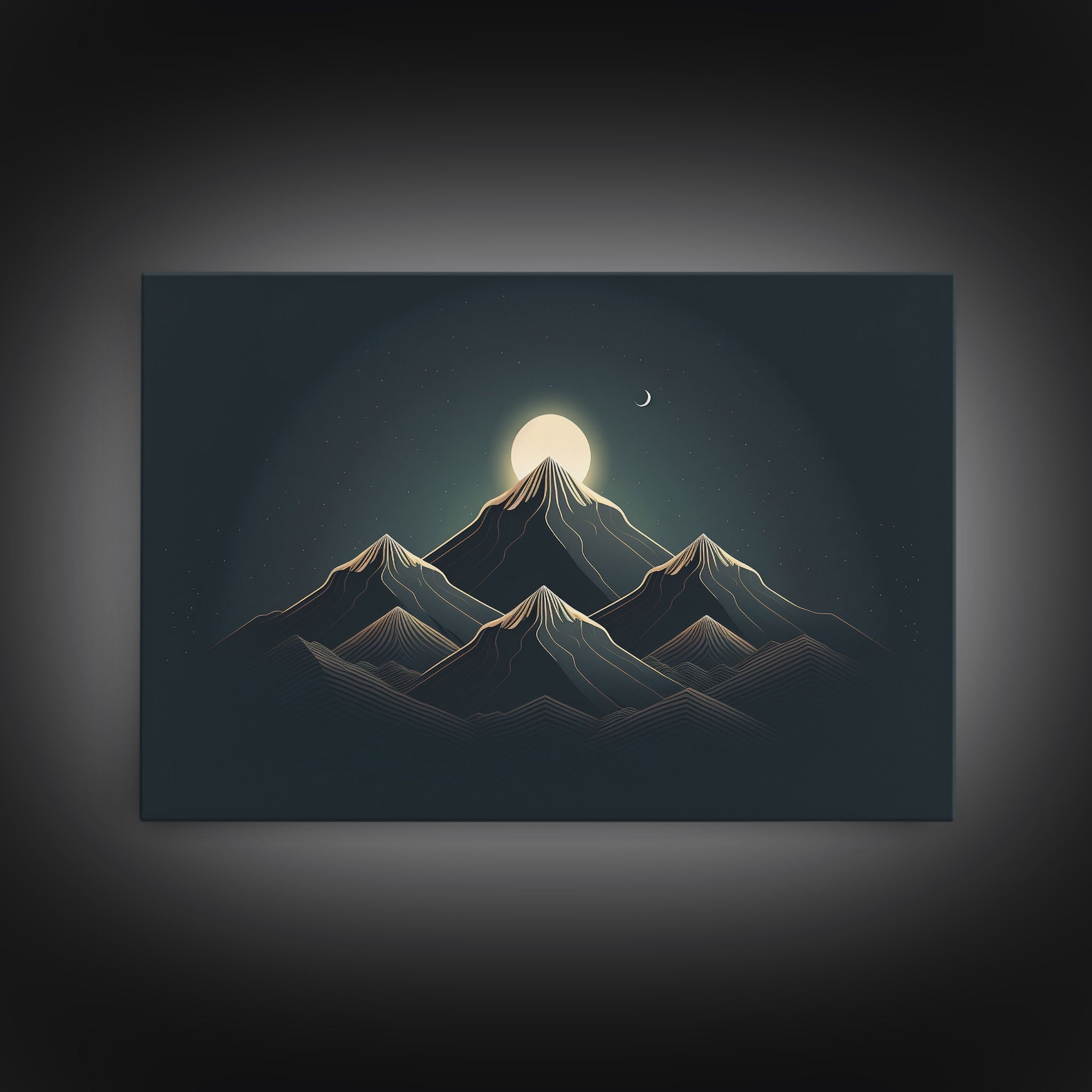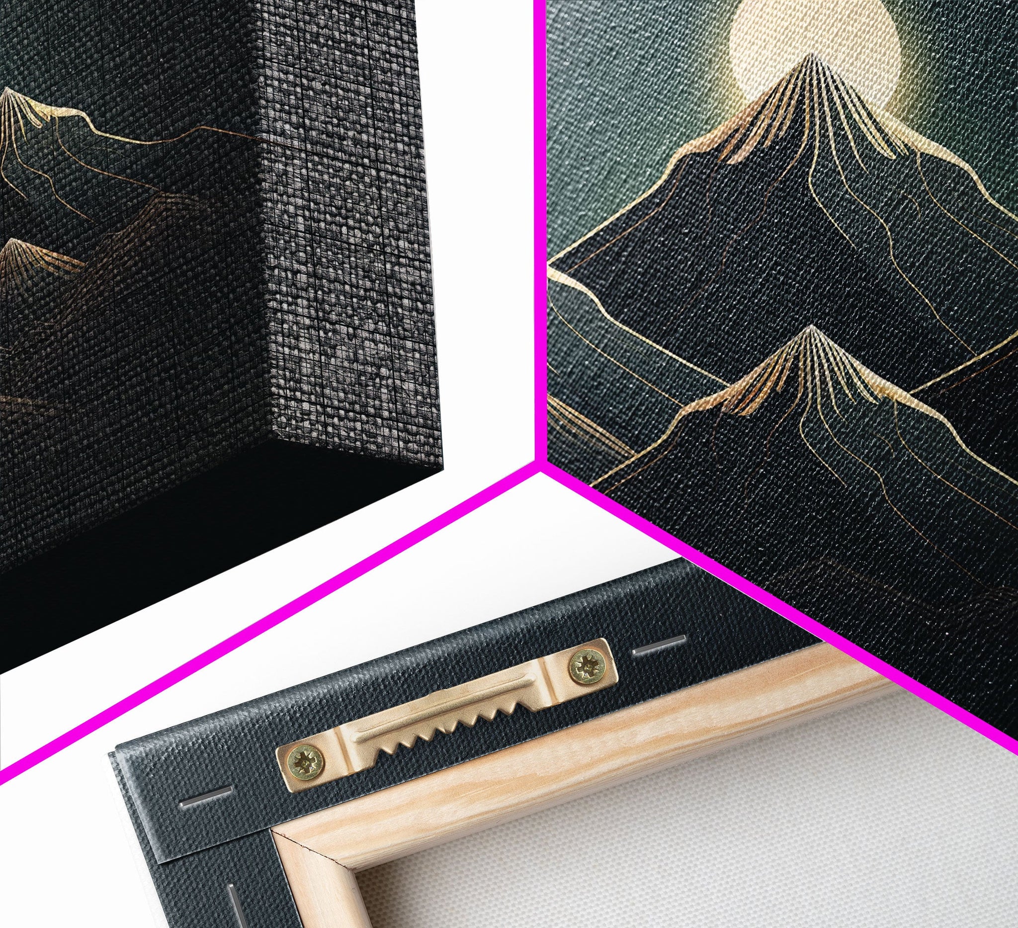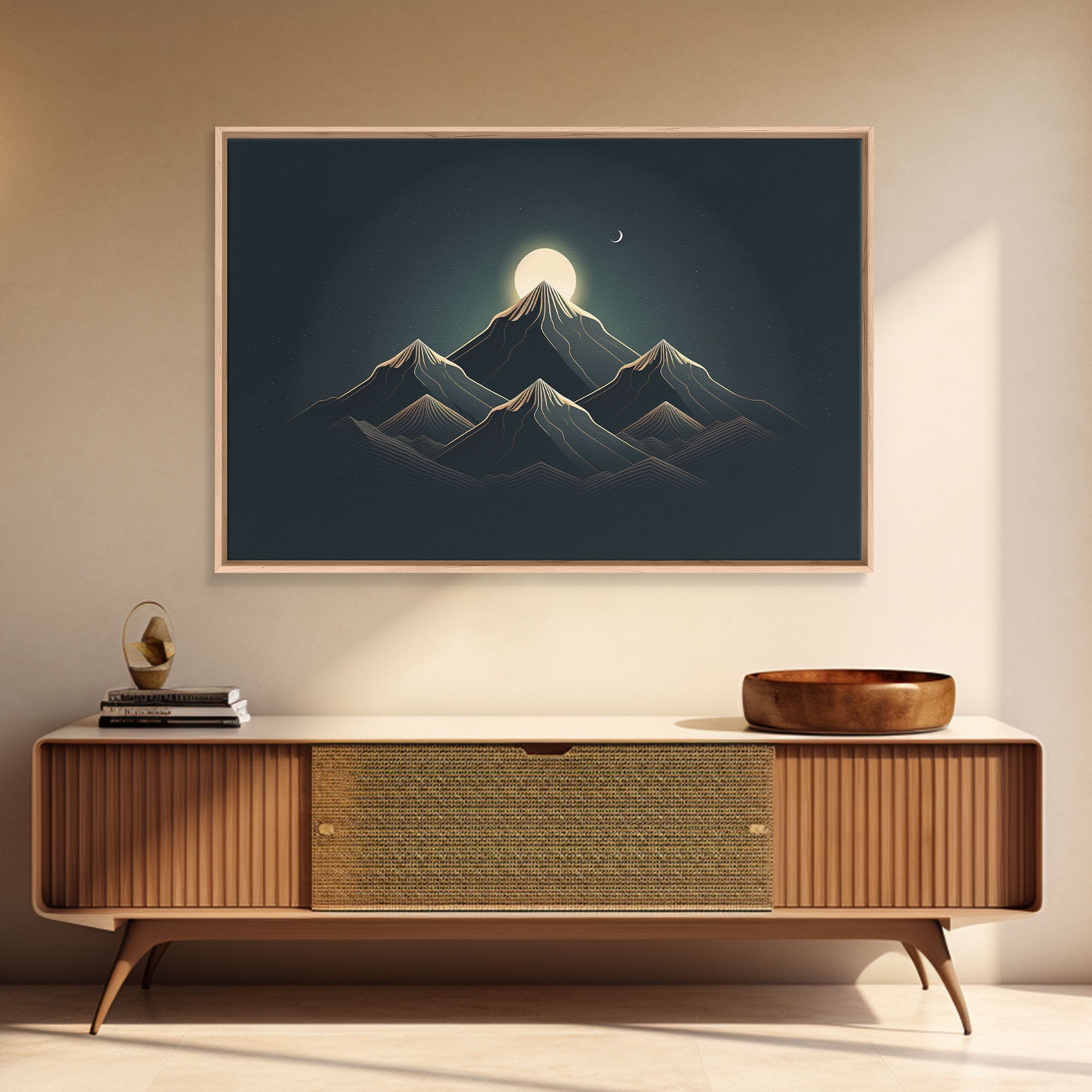 Black and Gold Art Deco Style Mountain landscape at Sunset, Framed Canvas Print, Large Format Wall Art, Huge Wall Decor