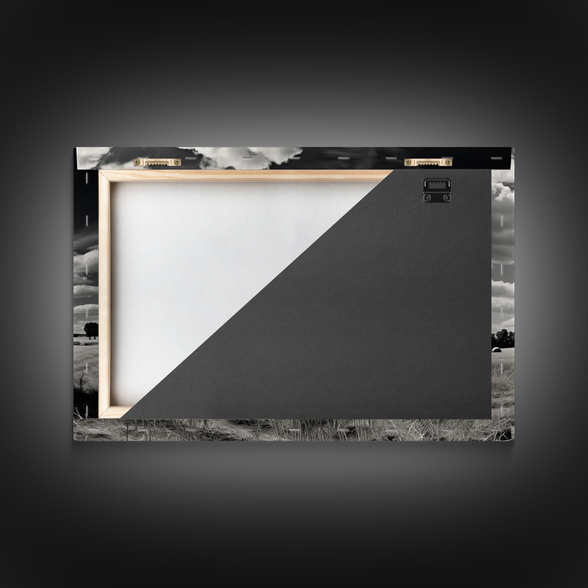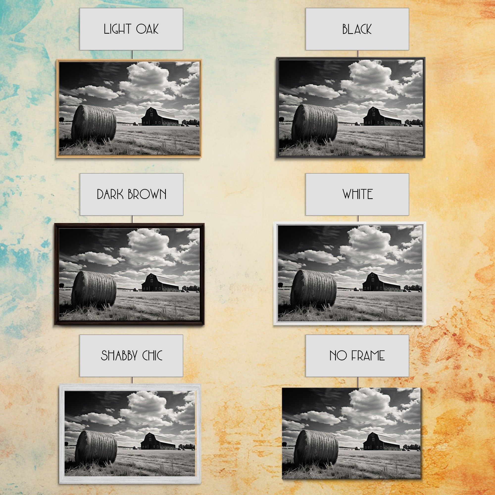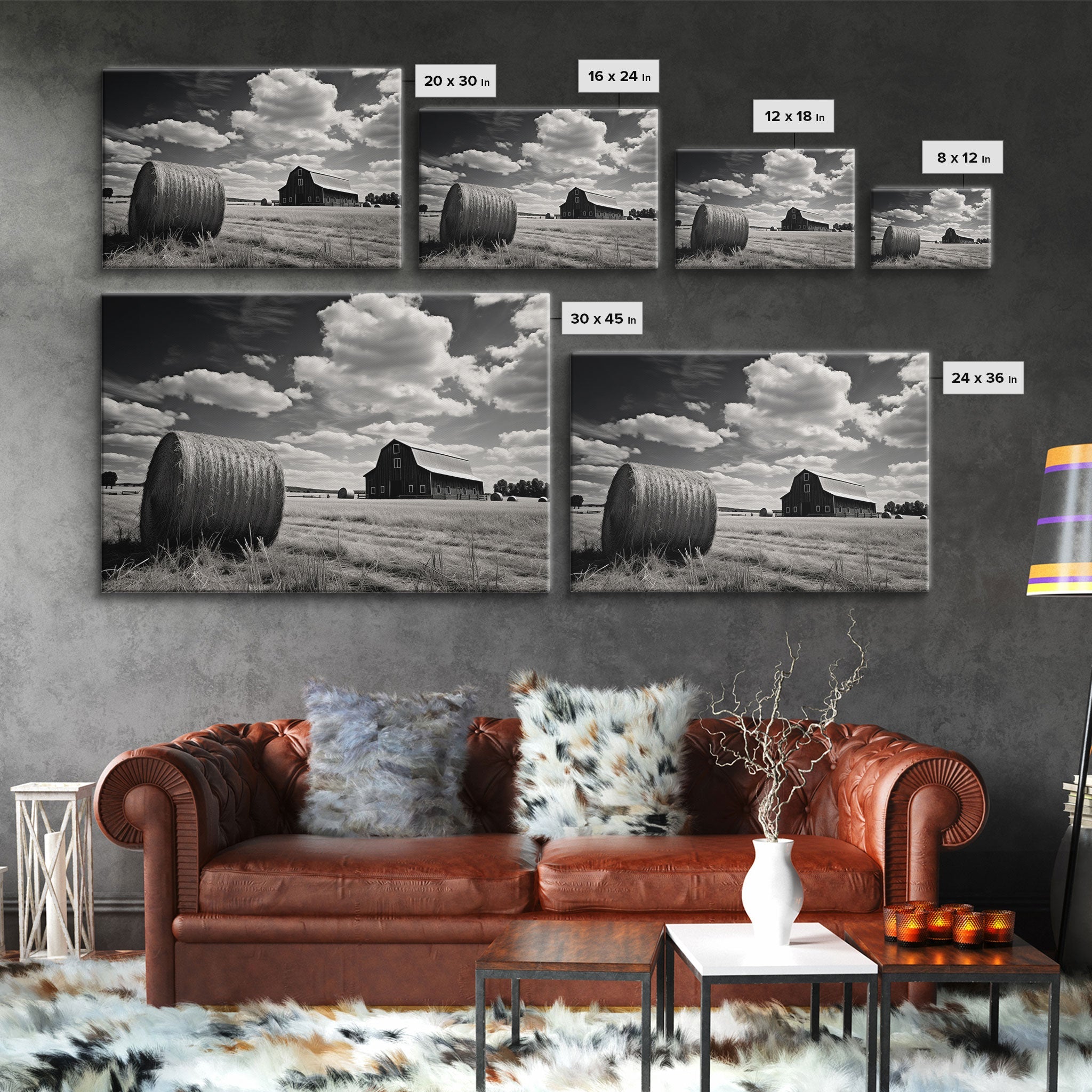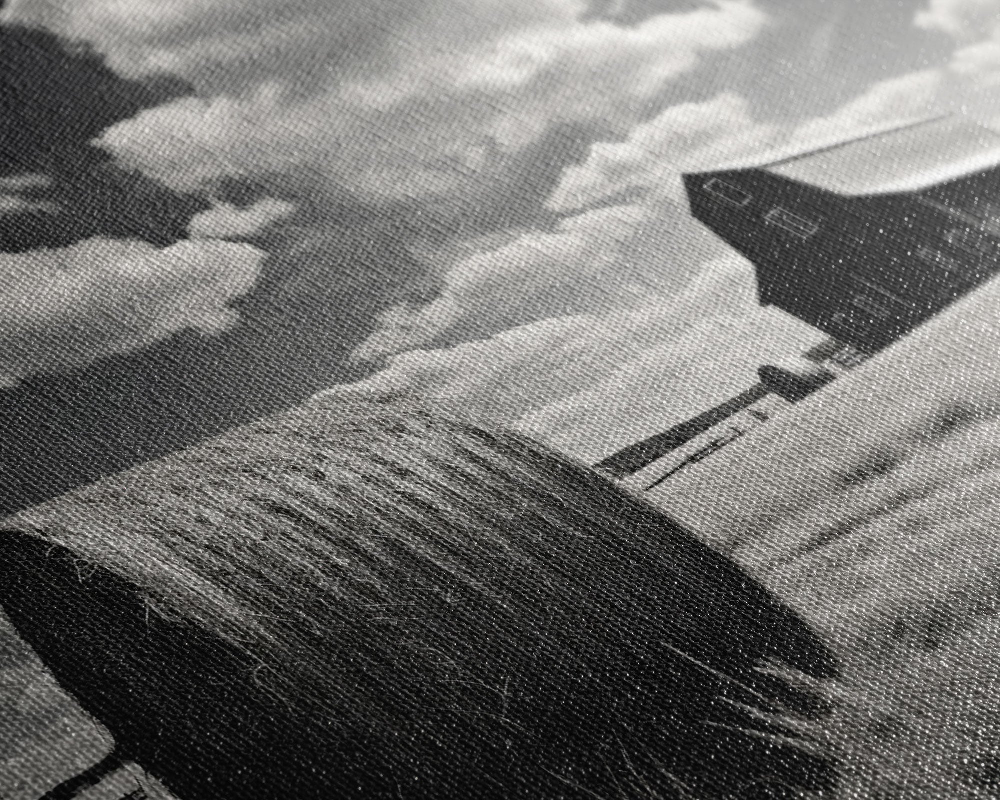 Black and White Photo Of a Barn and Hay Bail, Liminal Art, Country Decor, Farmhouse Style Art, Canvas Print