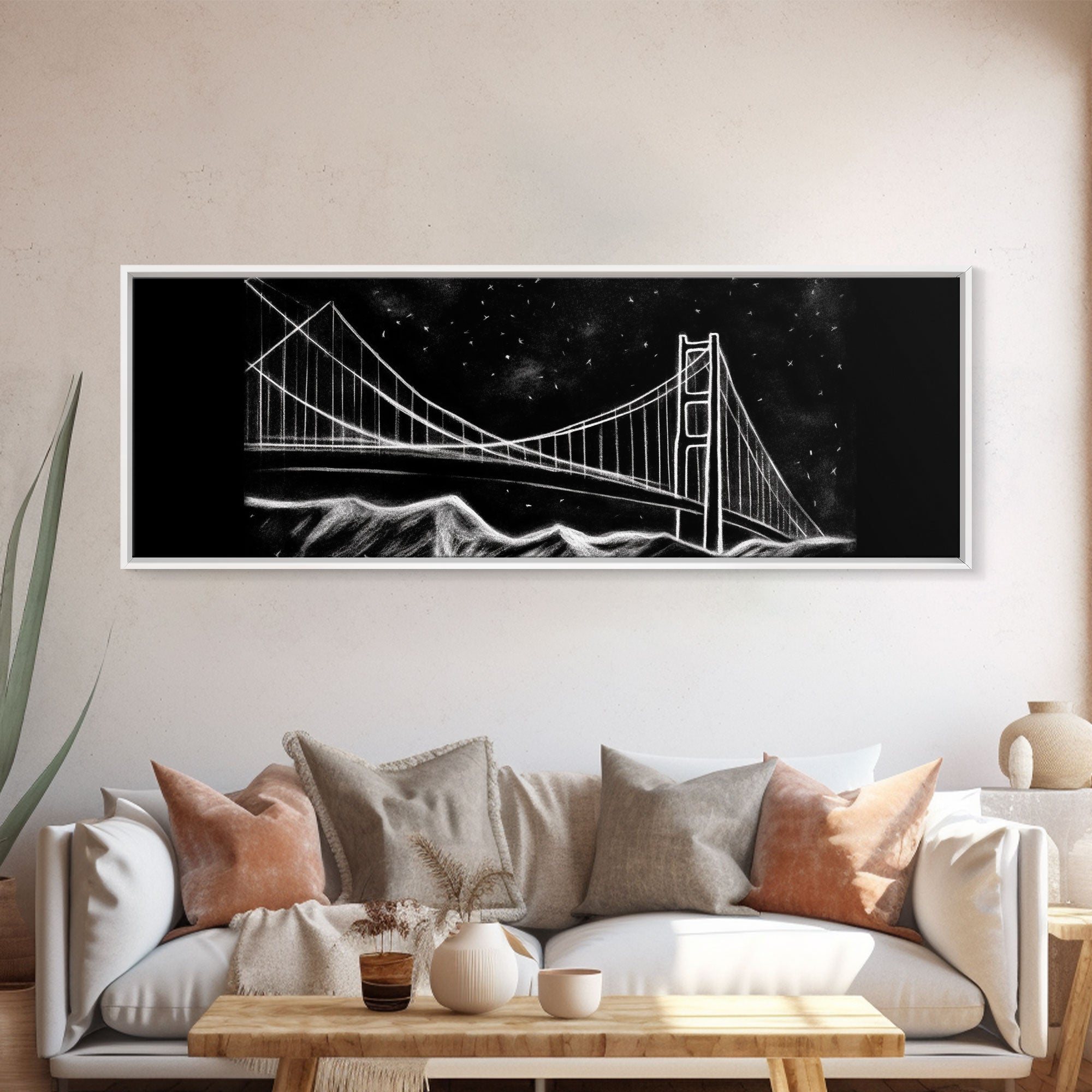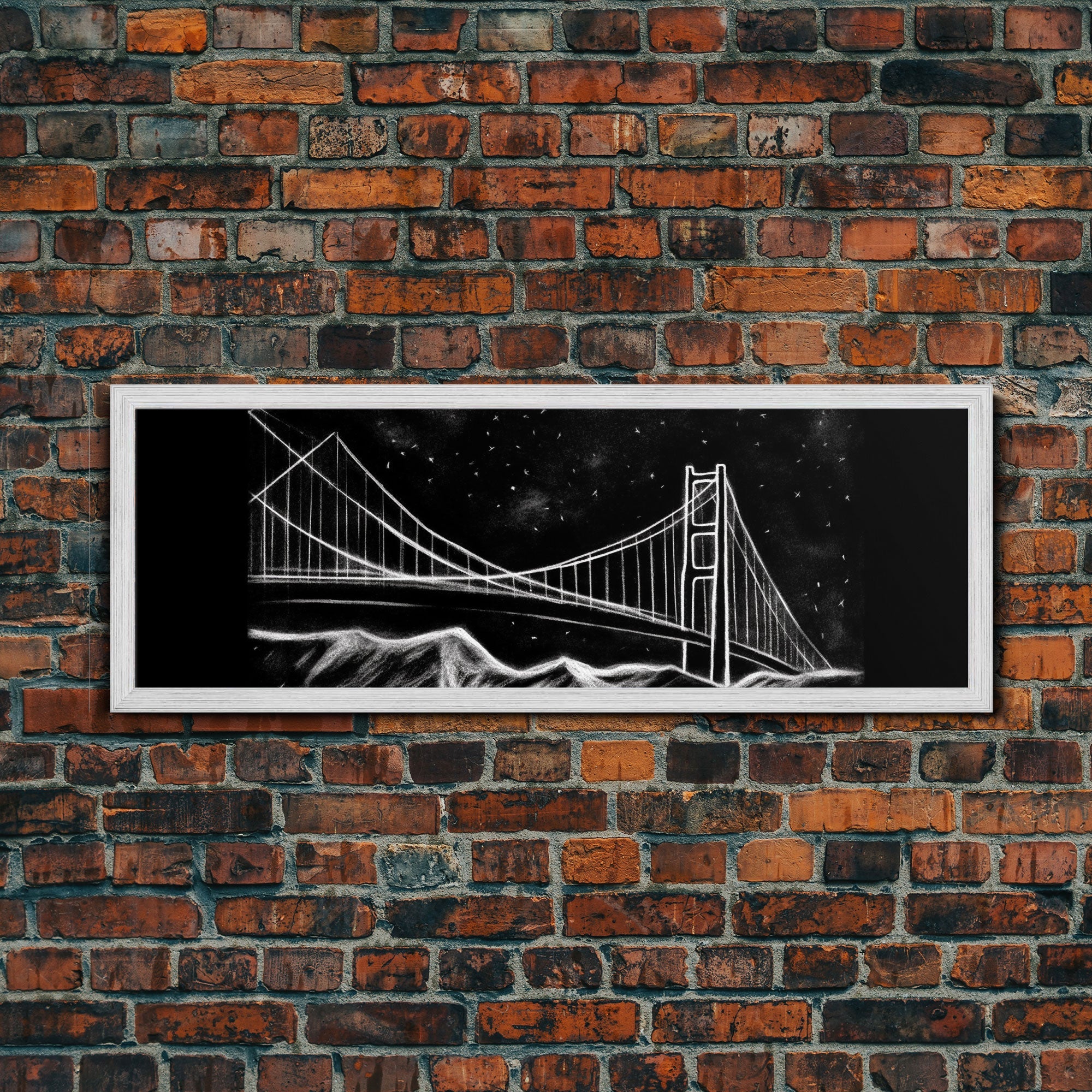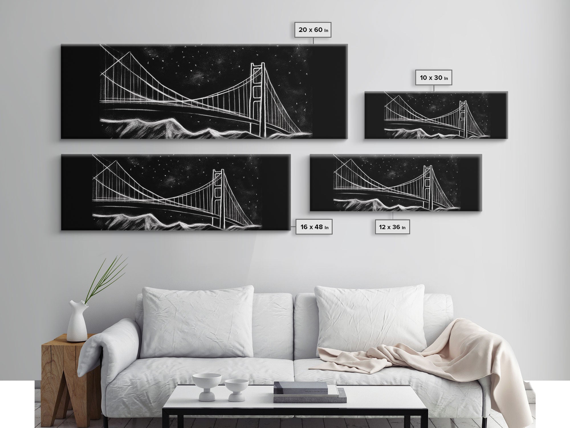 Black And White Suspension Bridge Canvas Print, Large Urban Art Print, Line Art, Chalk Wall Decor, Panoramic, Wall Art, Canvas Print