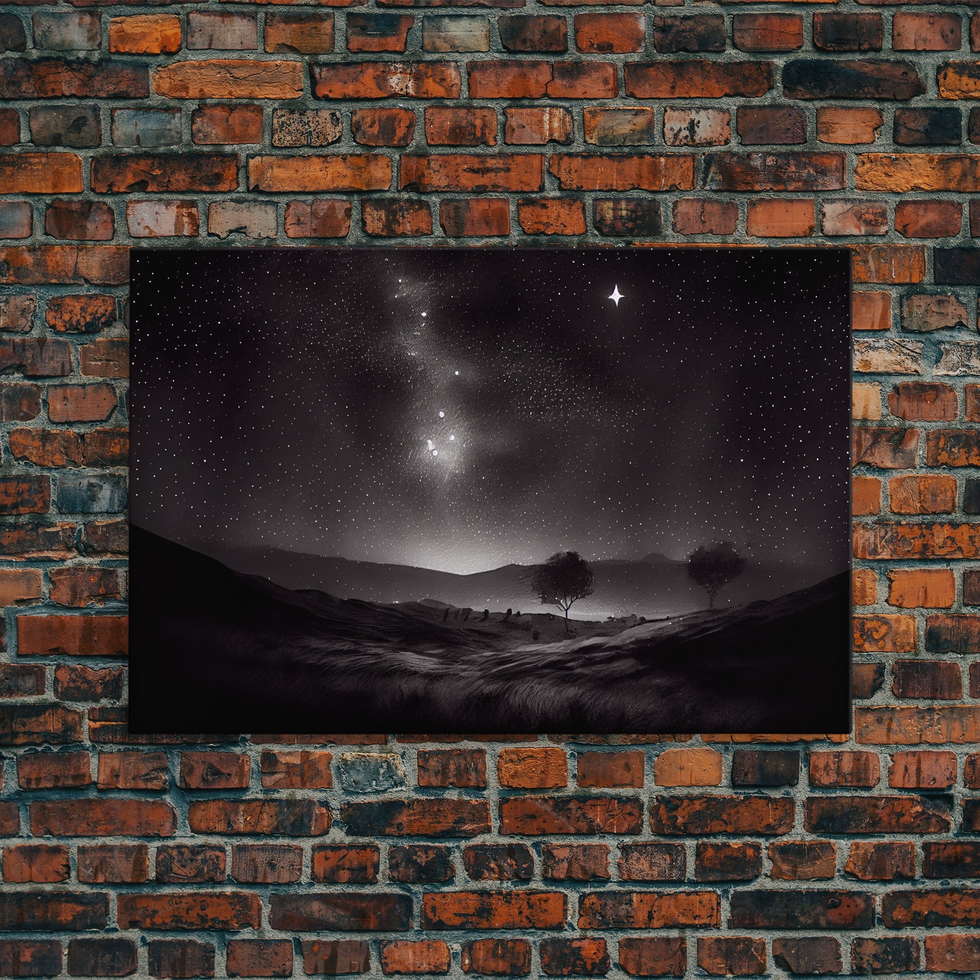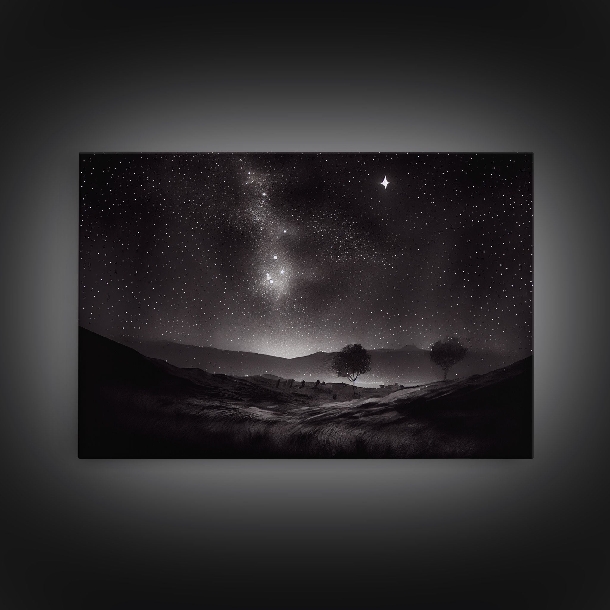 Black and white Watercolor of a starry night sky over the planes of Texas, framed canvas print