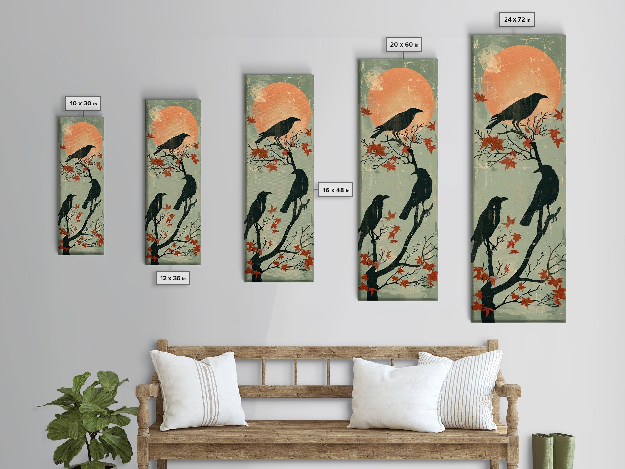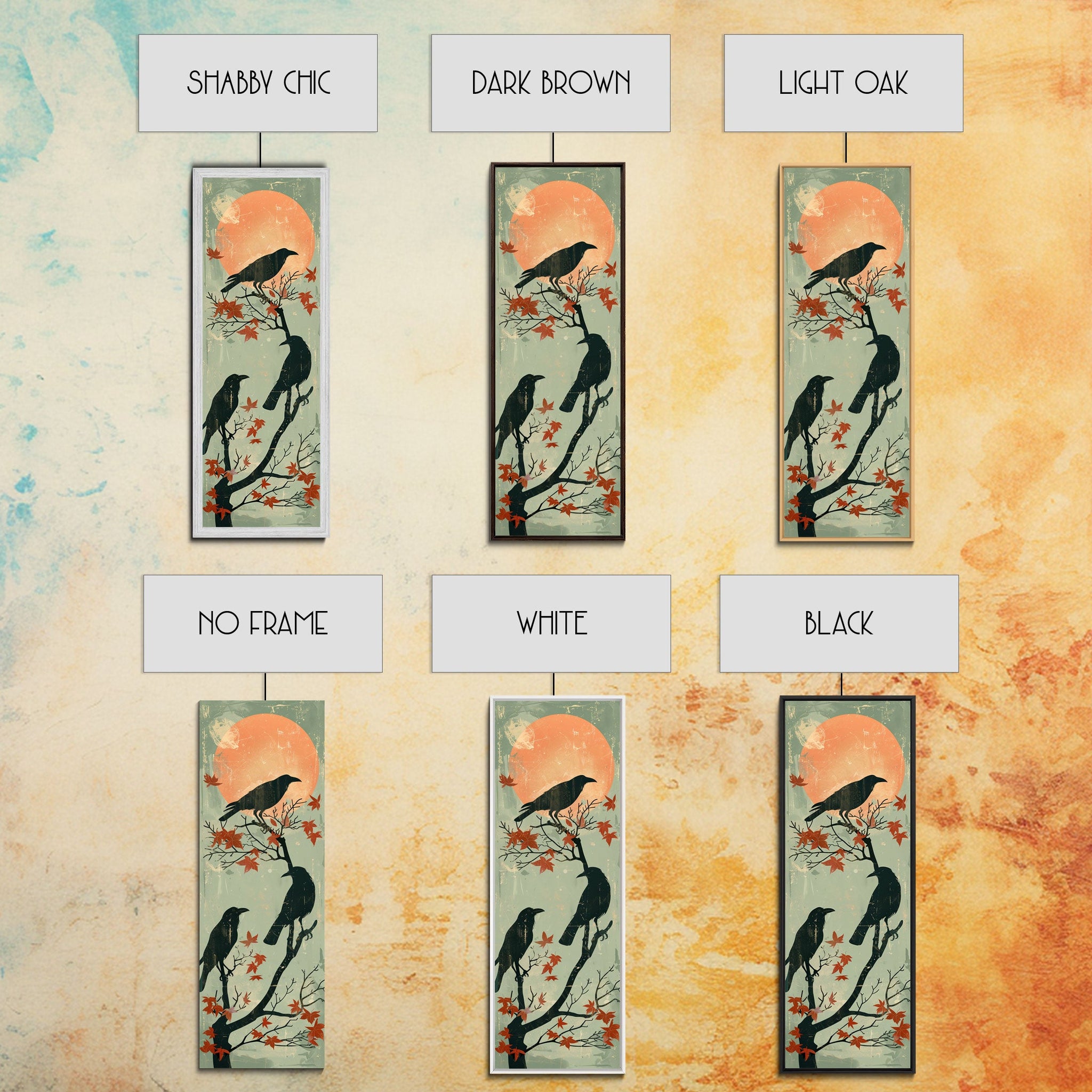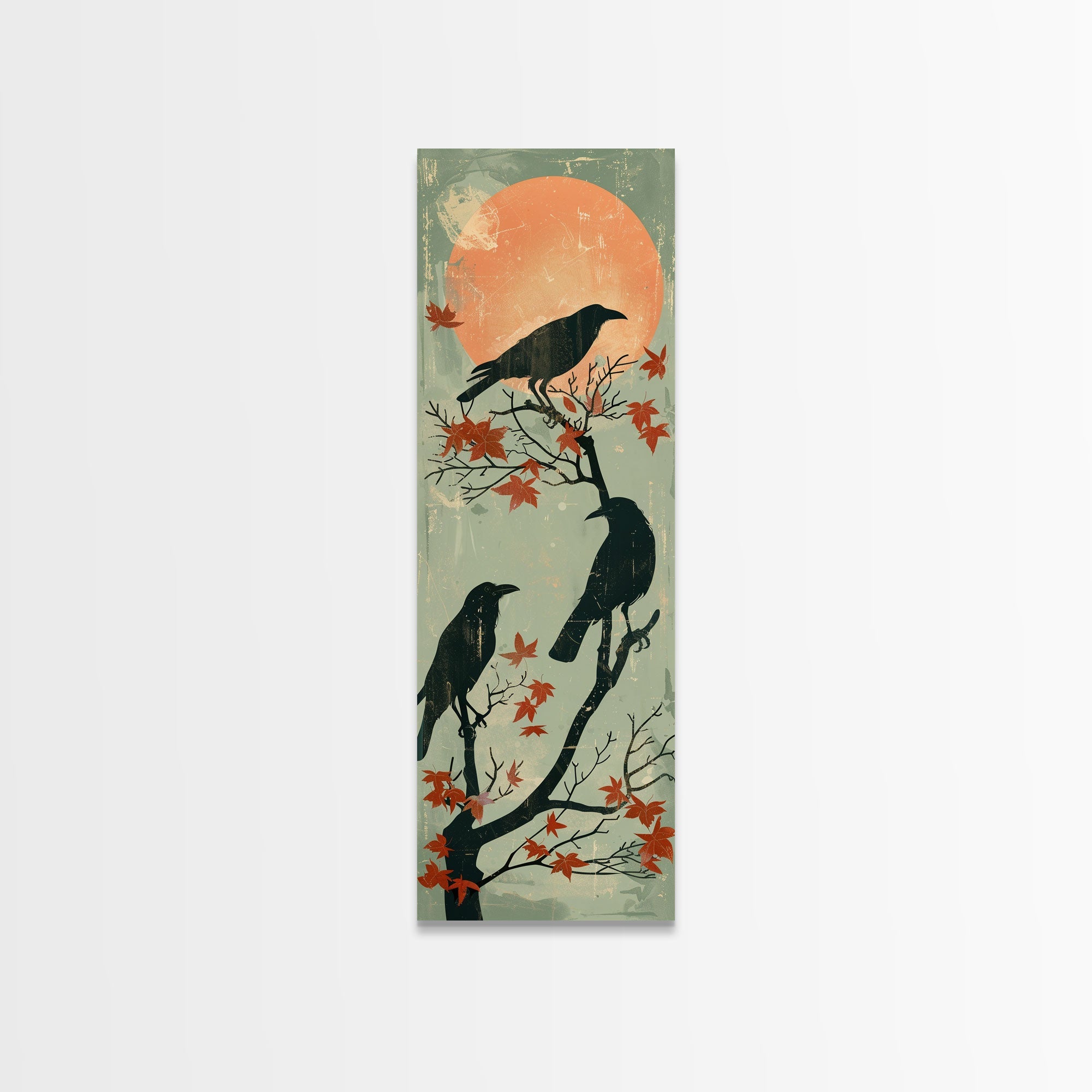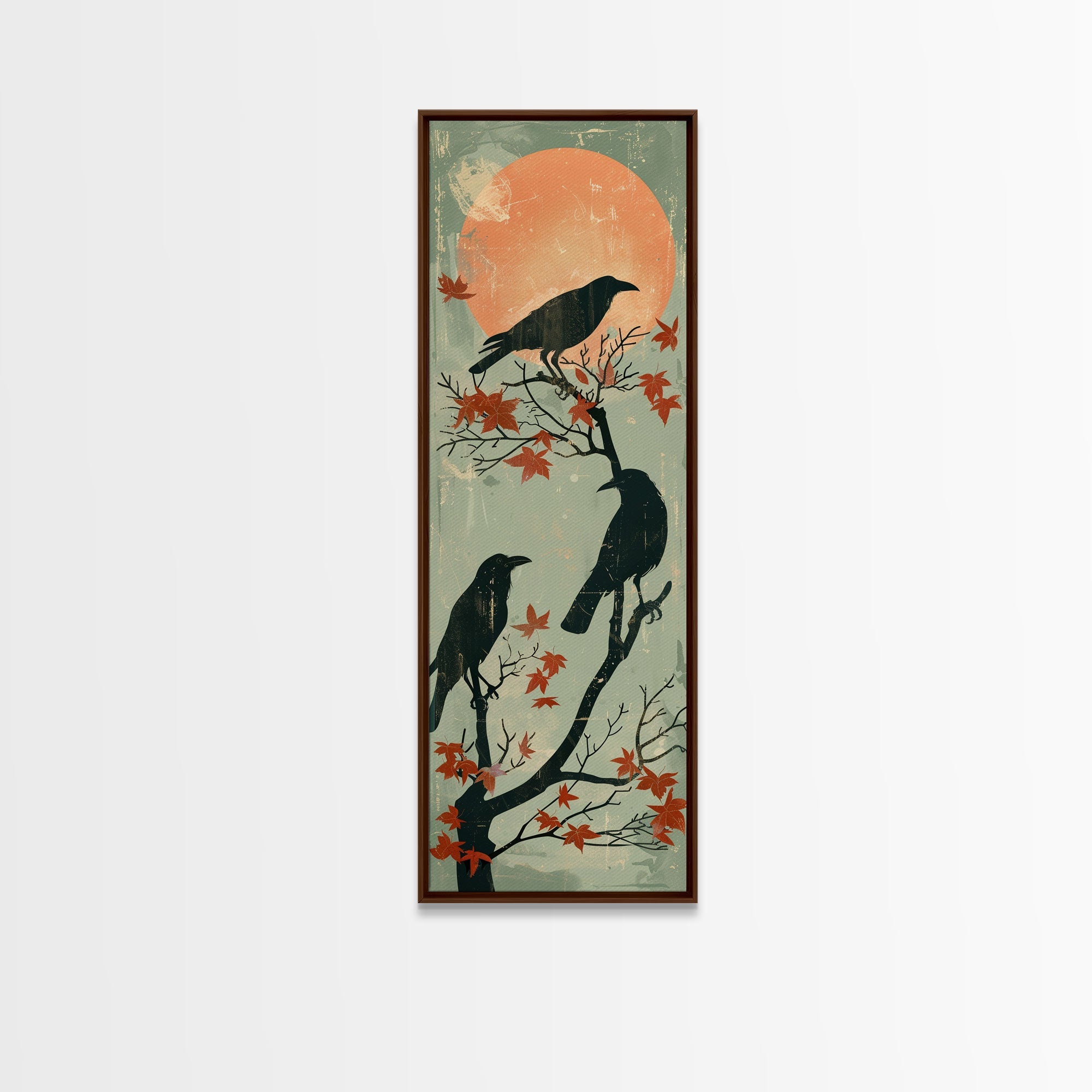 Black Crows Japanese Art Skinny Wall Art Framed Canvas Print on Branches with Red Maple Leaves Against Warm Orange Sun