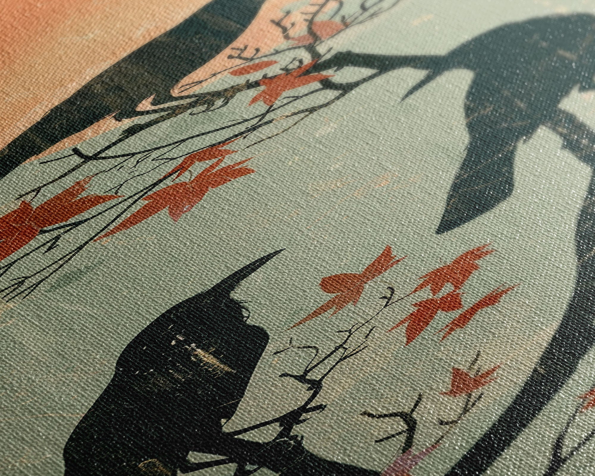 • Carregar imagem no visualizador da galeria, Black Crows Japanese Art Skinny Wall Art Framed Canvas Print on Branches with Red Maple Leaves Against Warm Orange Sun