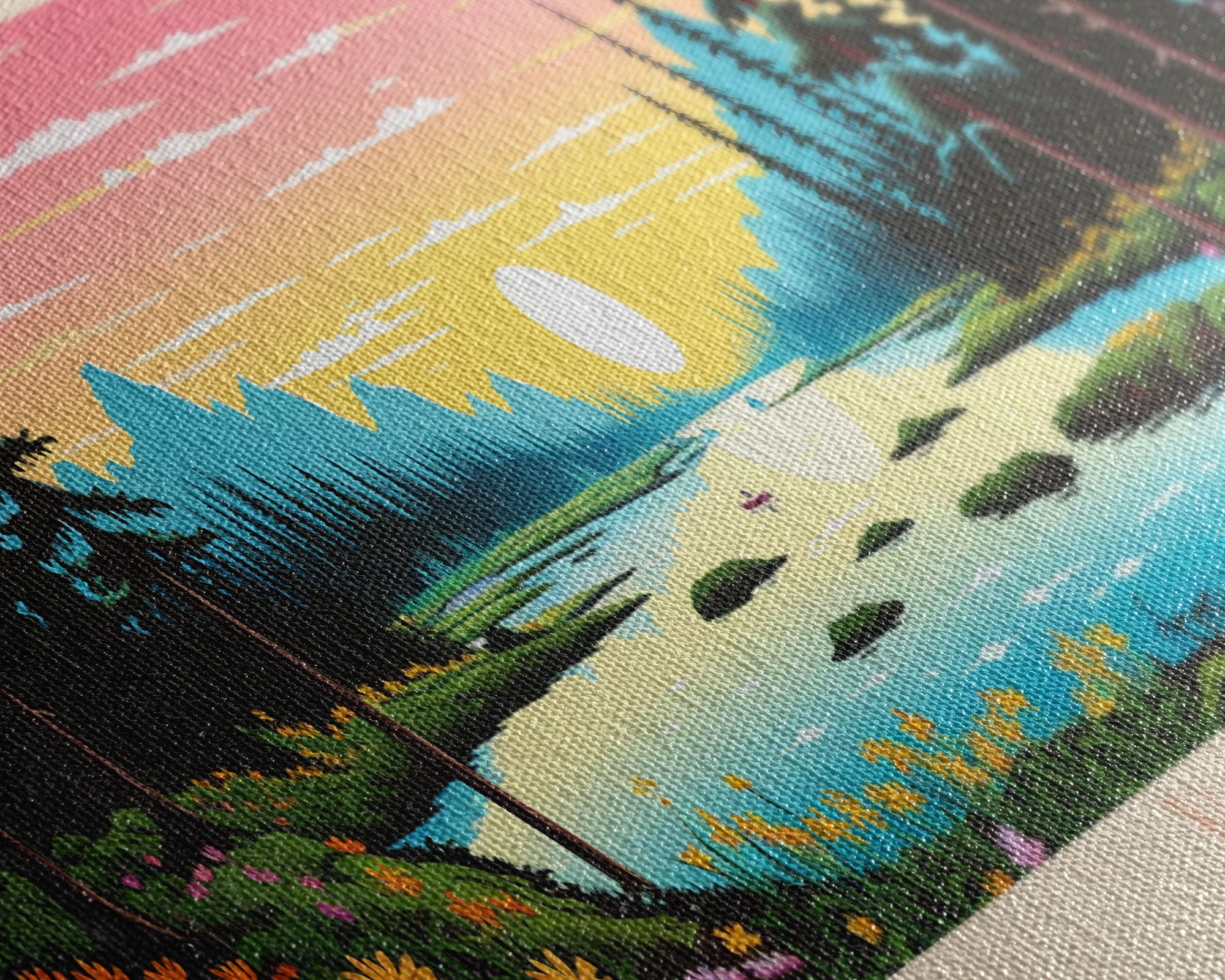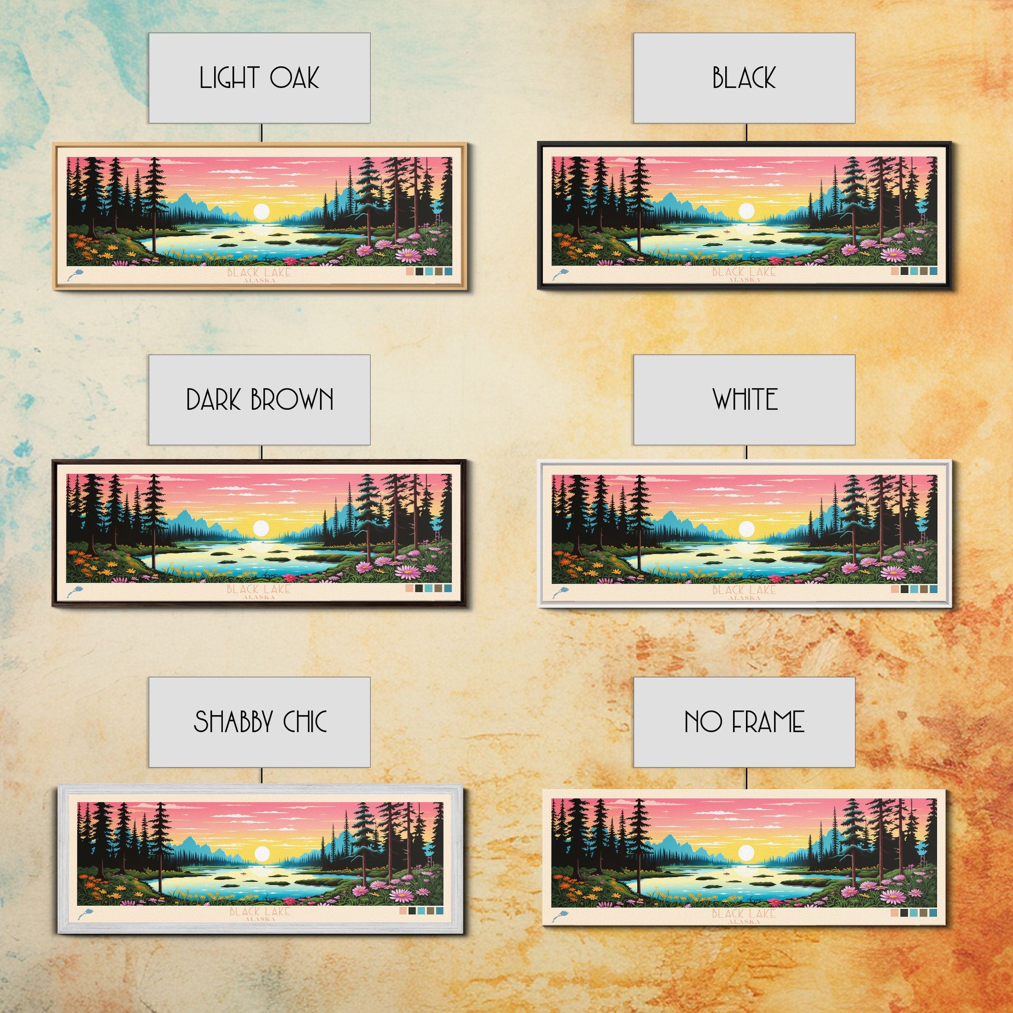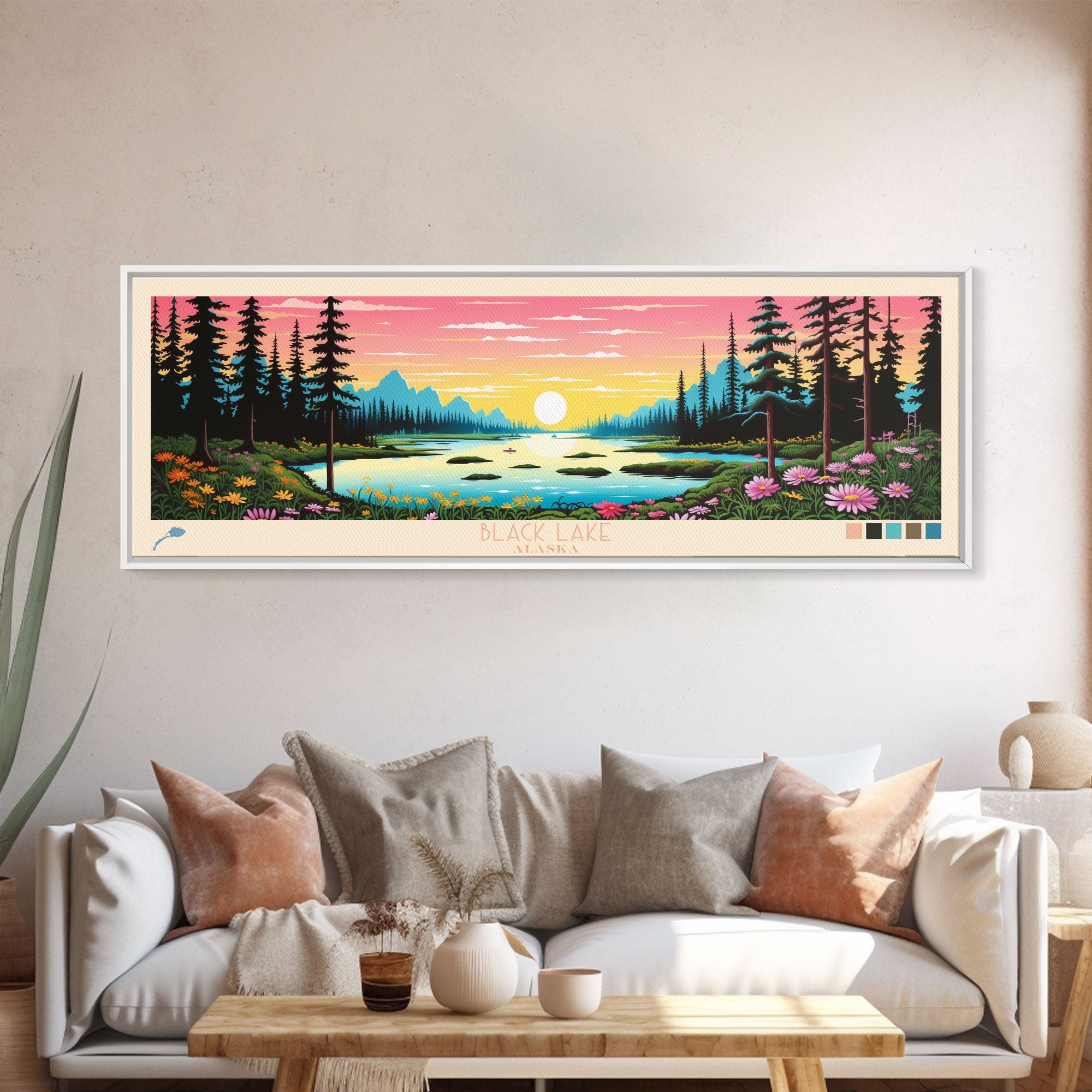 Black Lake Southwest Alaska Framed Canvas Print, Panoramic Travel Poster, Midcentury Modern Wall Art, Pop Art, Nature Bedroom Decor, Scenic Lake House Art