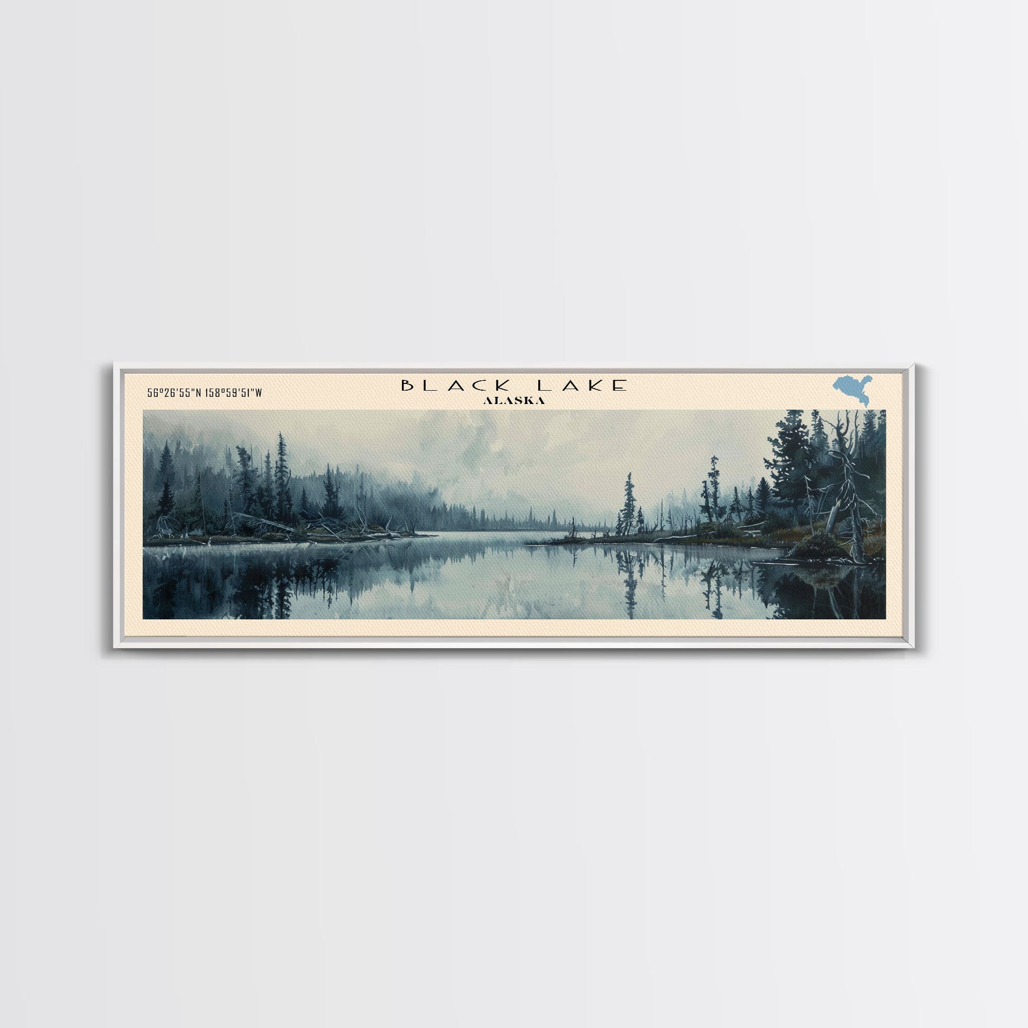 Black Lake USA SW Alaska Framed Canvas Print, Lake House Art, Panoramic Scenic View, Travel Poster, Rustic Art, Lake Painting