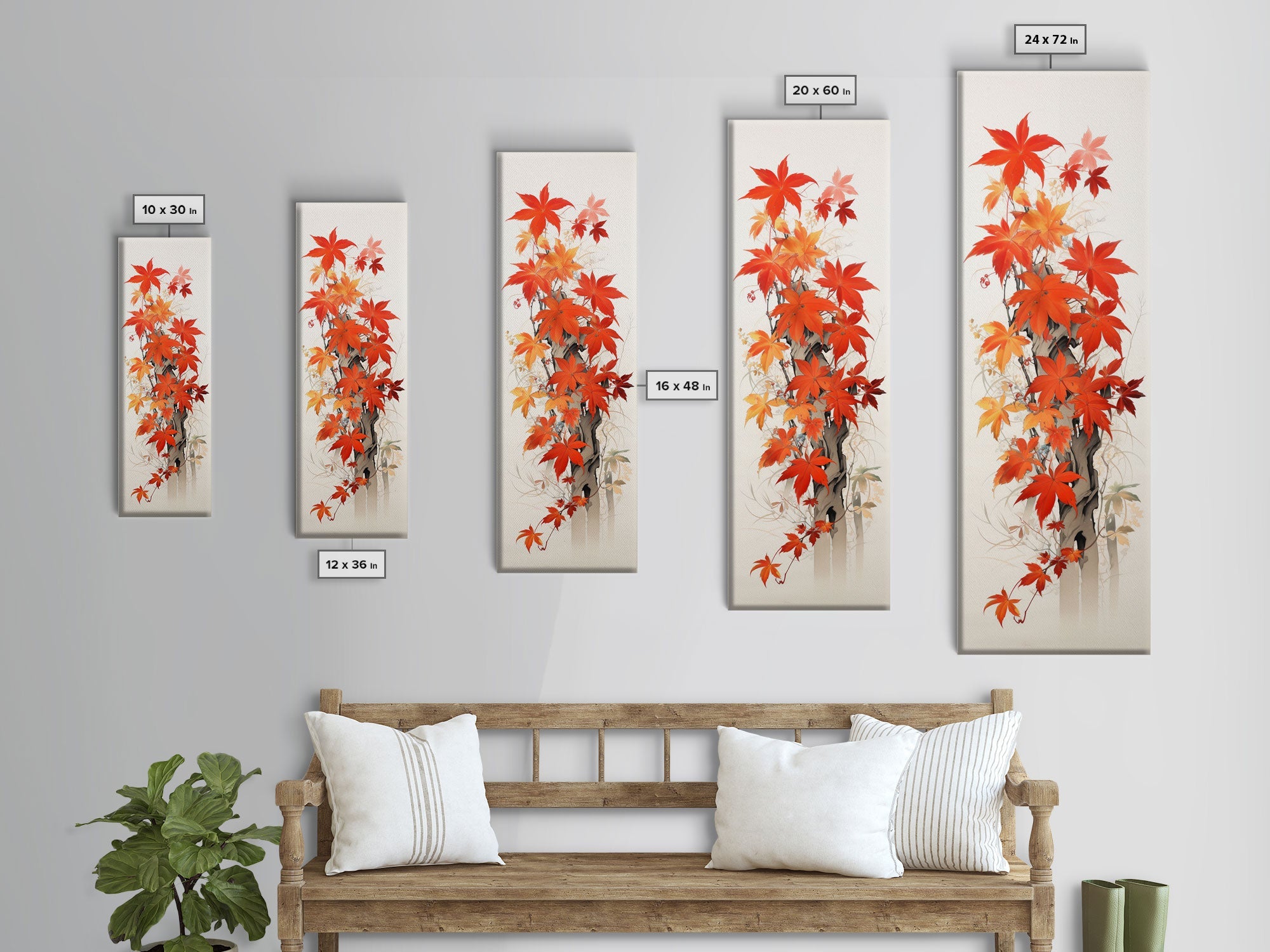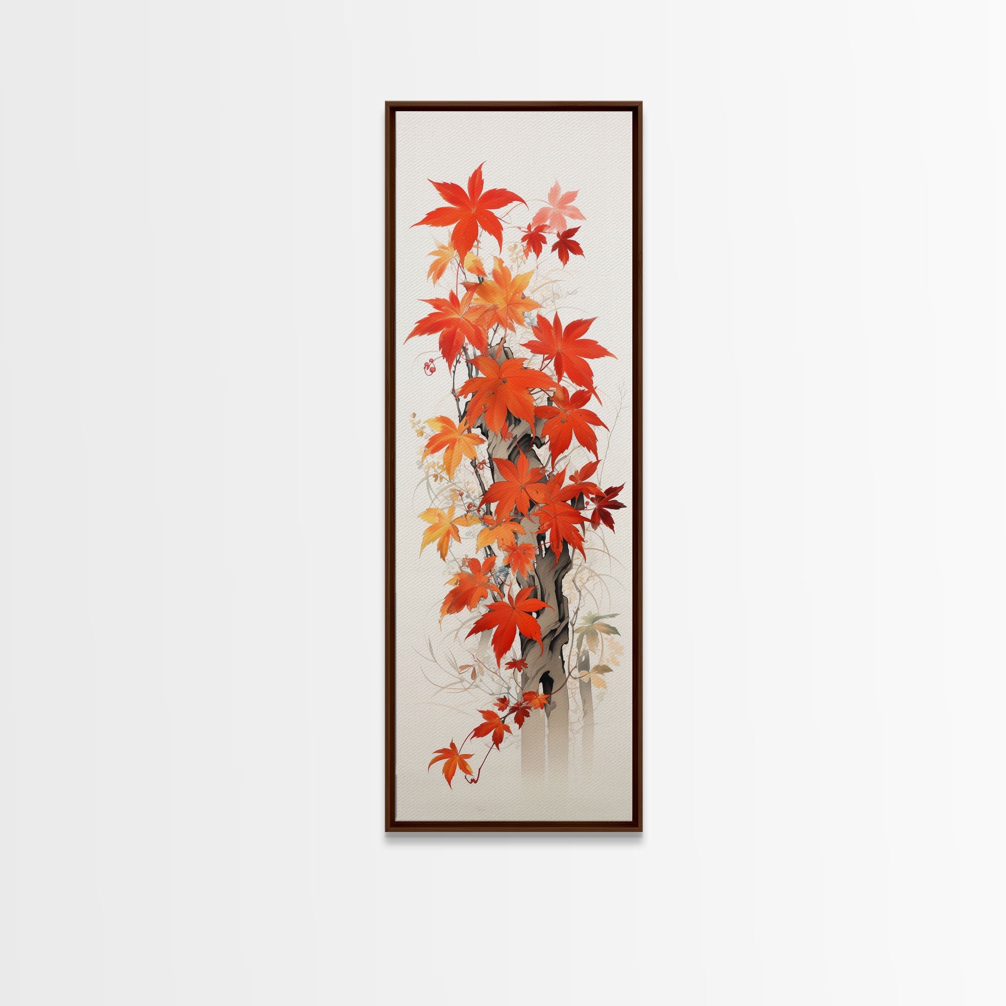 Brilliant Red Leaves On A Twisted Tree, Framed Canvas Print In Skinny Tall Style, Ideal For Feng Shui Wall Art In Japanese Style Art