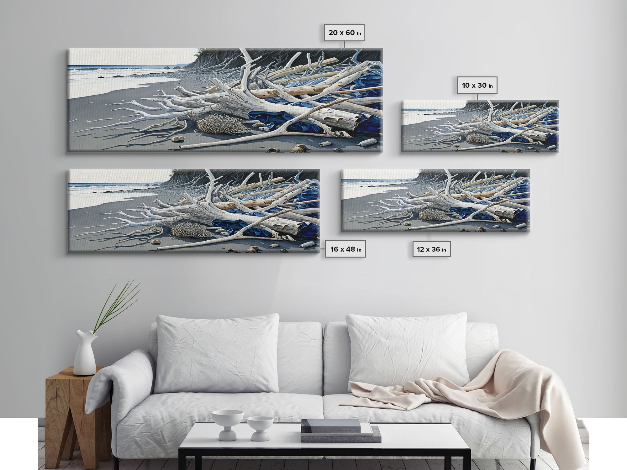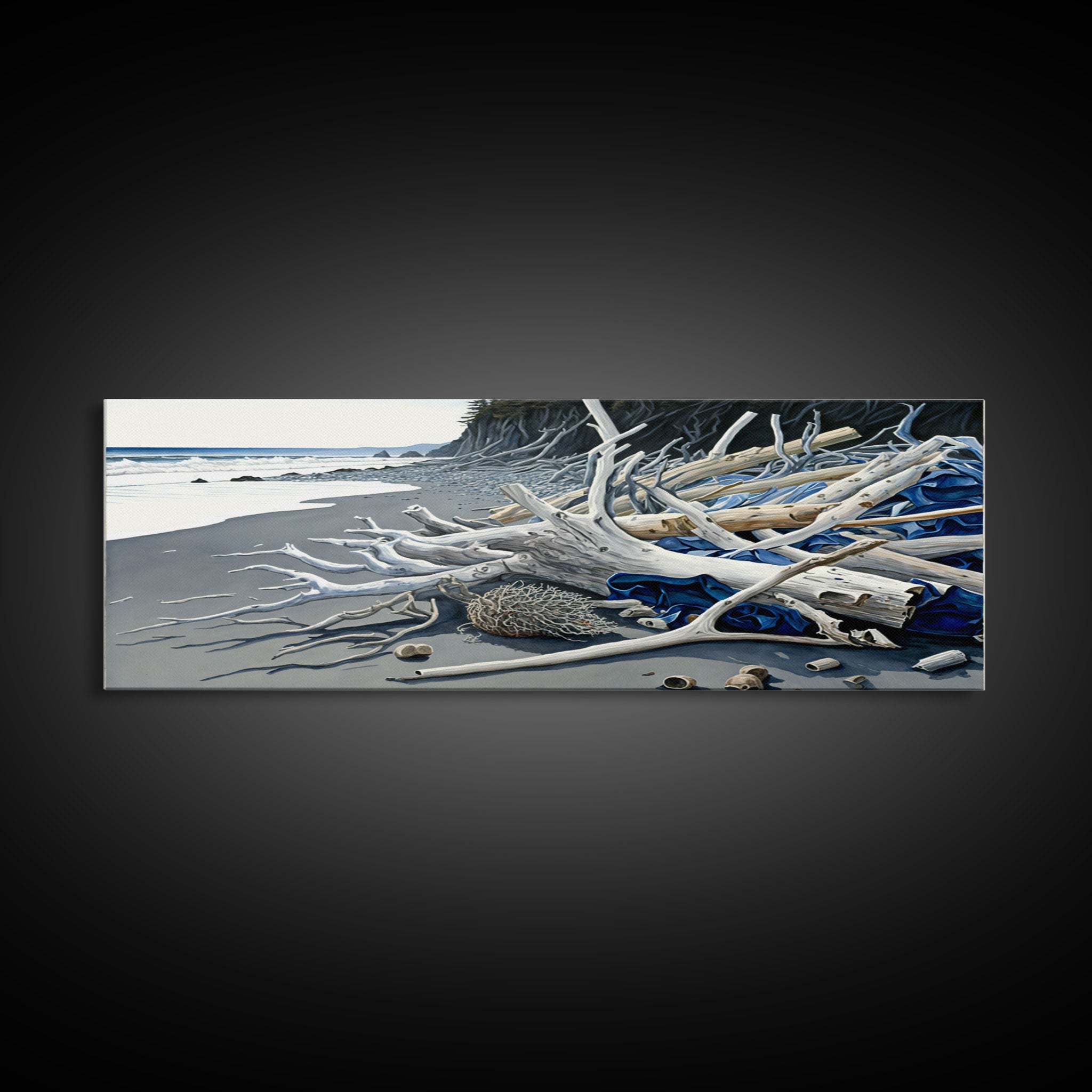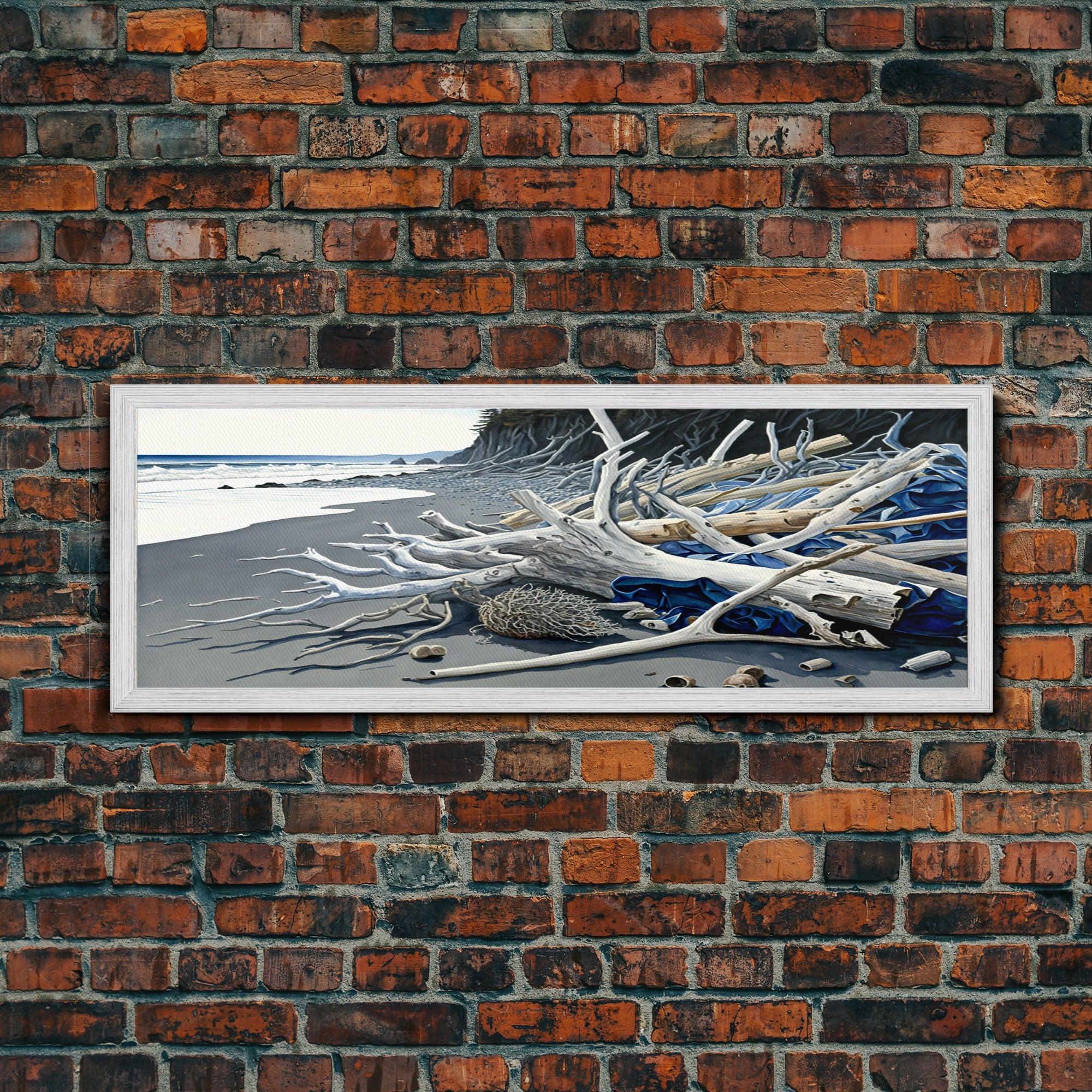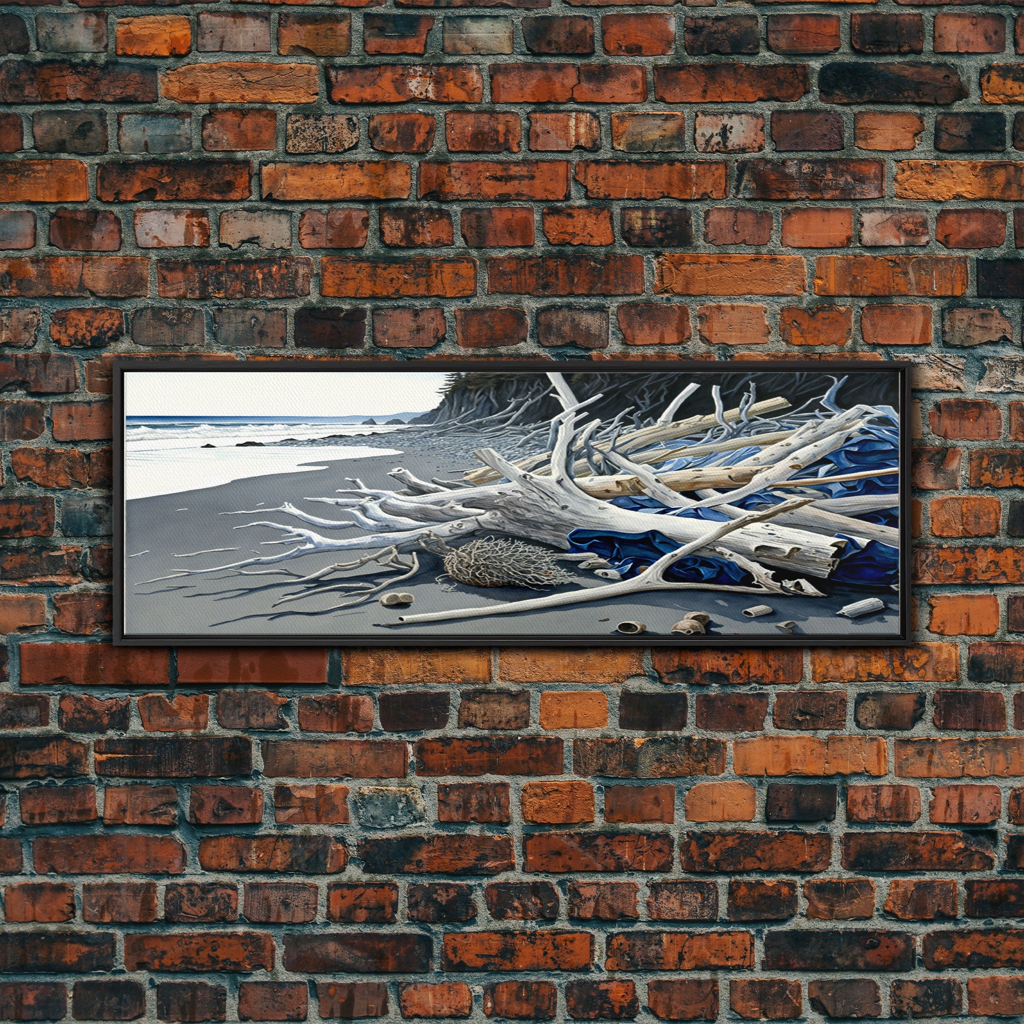 Driftwood, Panoramic Framed Canvas Print, Pacific Northwest / Washington State Driftwood Washed Up On The Shore, Extra Wide Format Art