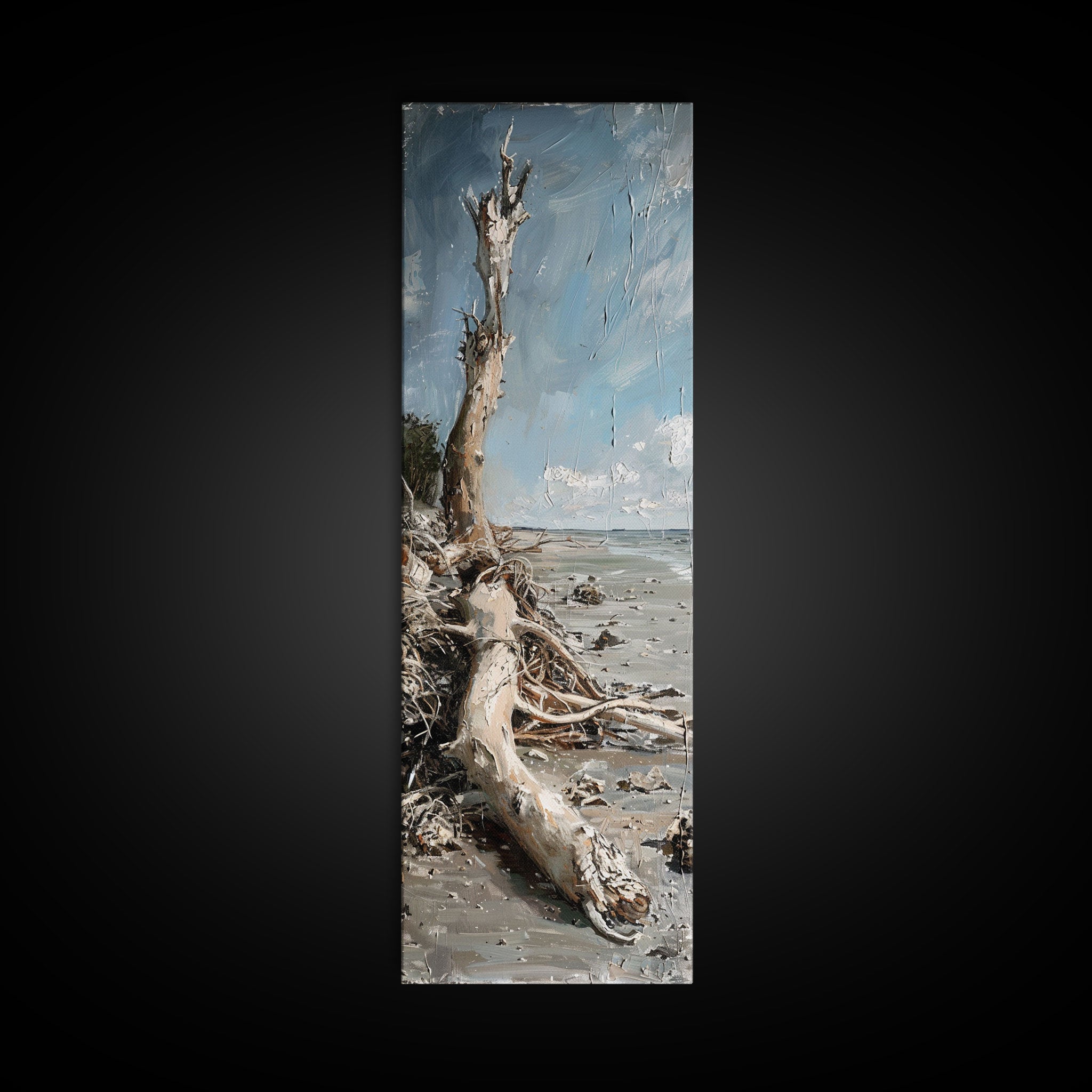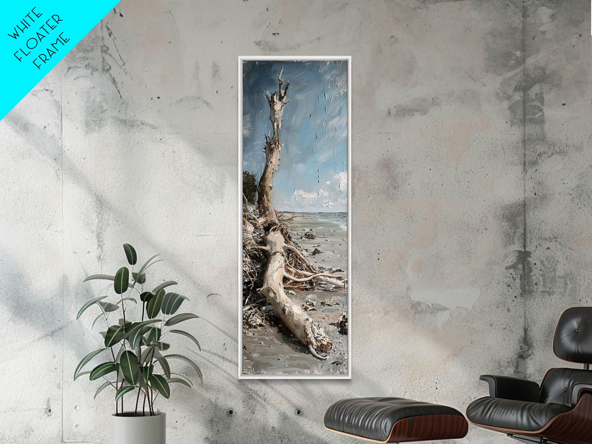 Framed Canvas Print Skinny Art of a Weathered Driftwood Tree Trunk on a Sandy Shore with a Calm Ocean Backdrop, Ideal Tall Art for Coastal Decor