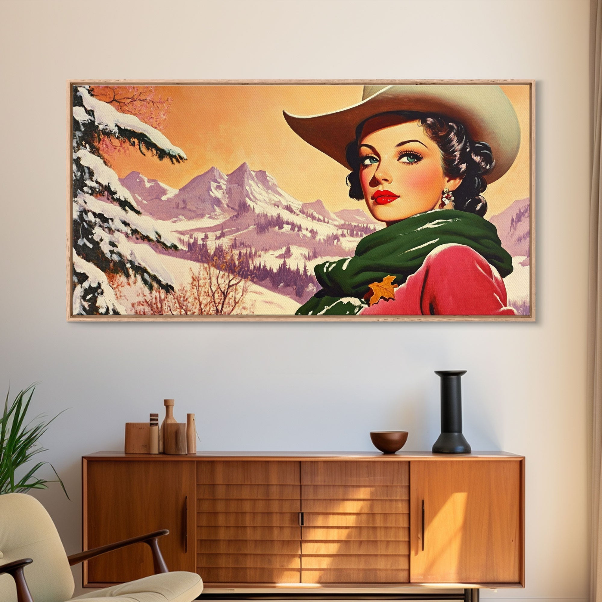 Framed Canvas Print winter wonderland scene, snow-covered trees and a peaceful horizon, serene holiday wall art ideal rustic Christmas decor
