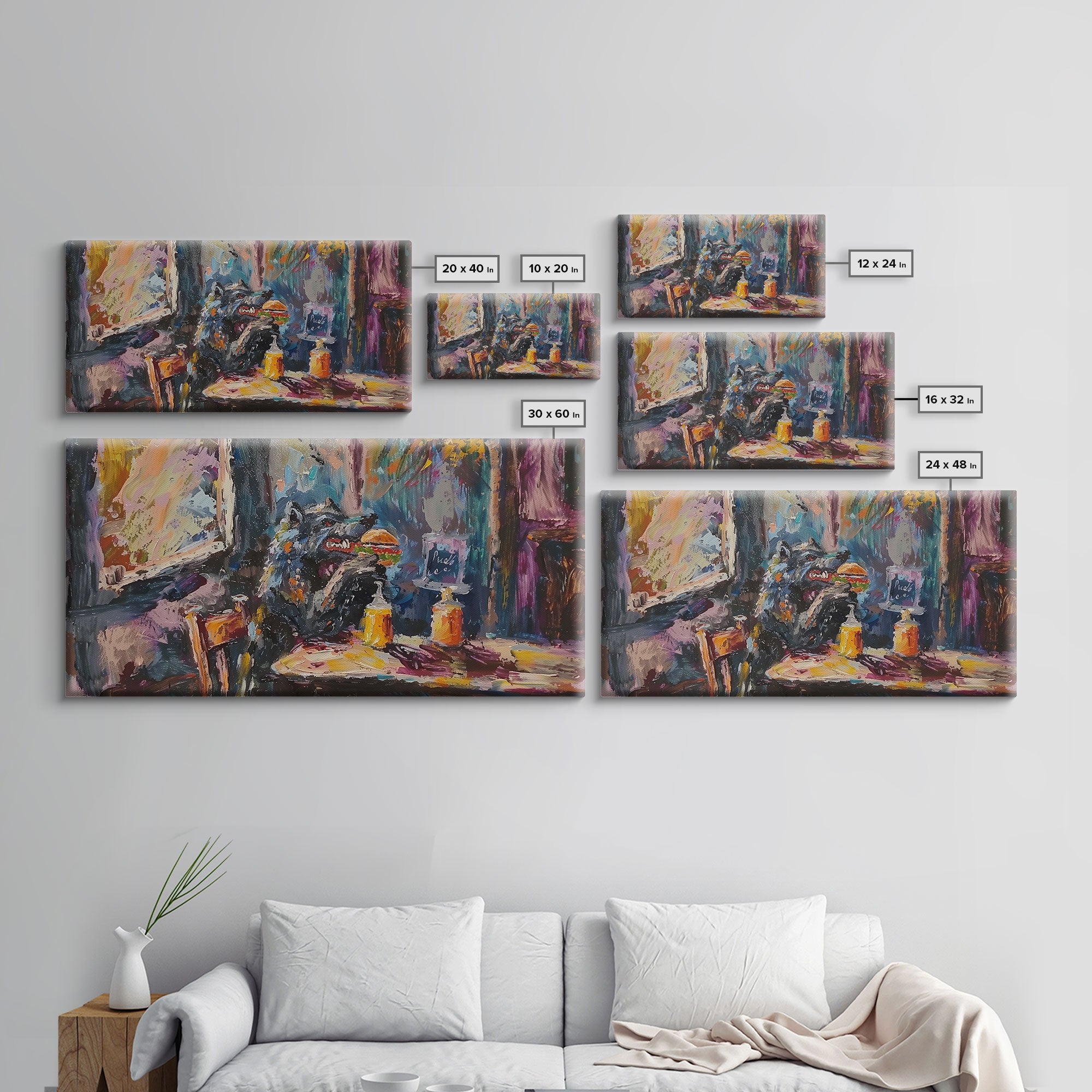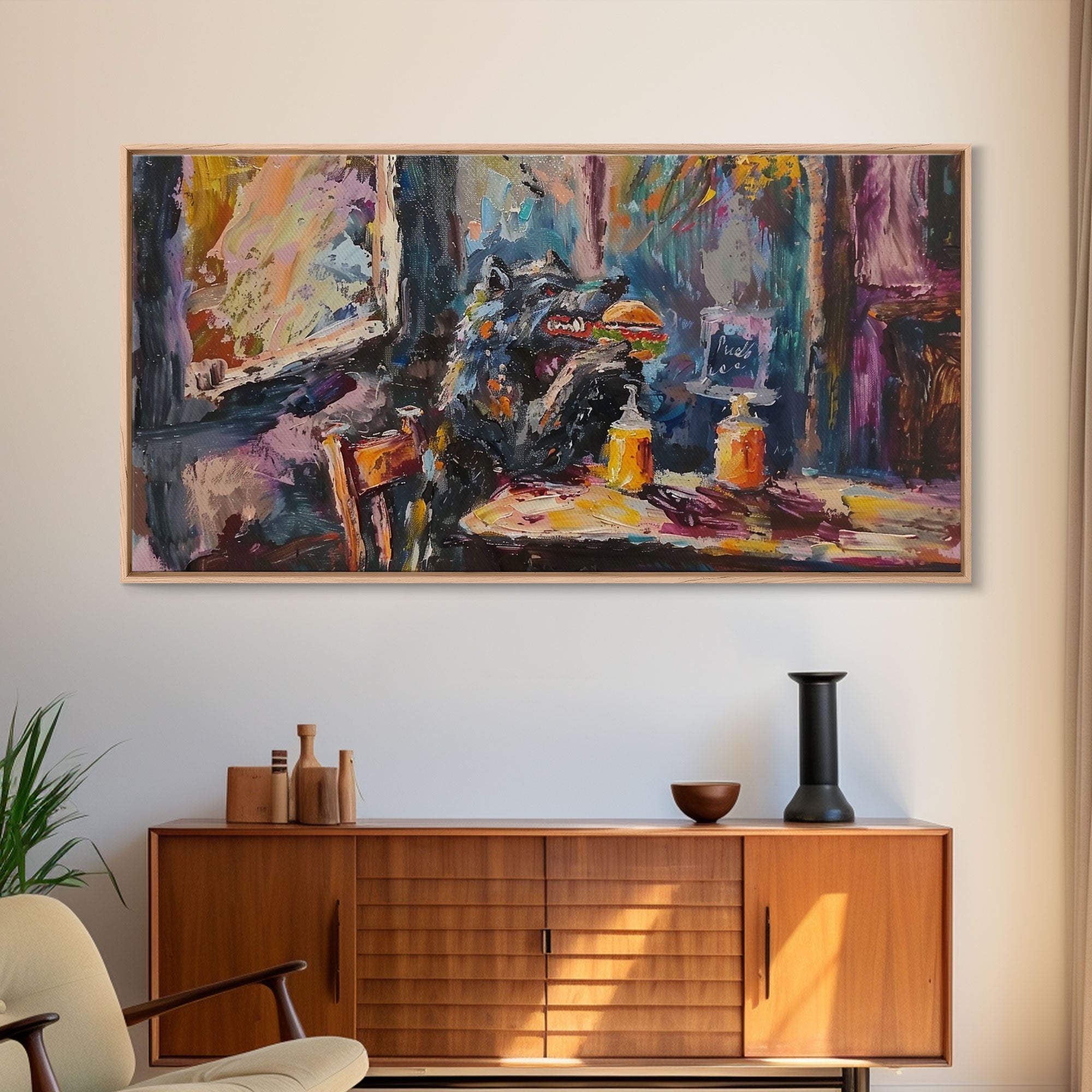 Funny Werewolf Having a Cheeseburger in a diner, framed canvas print, halloween decor
