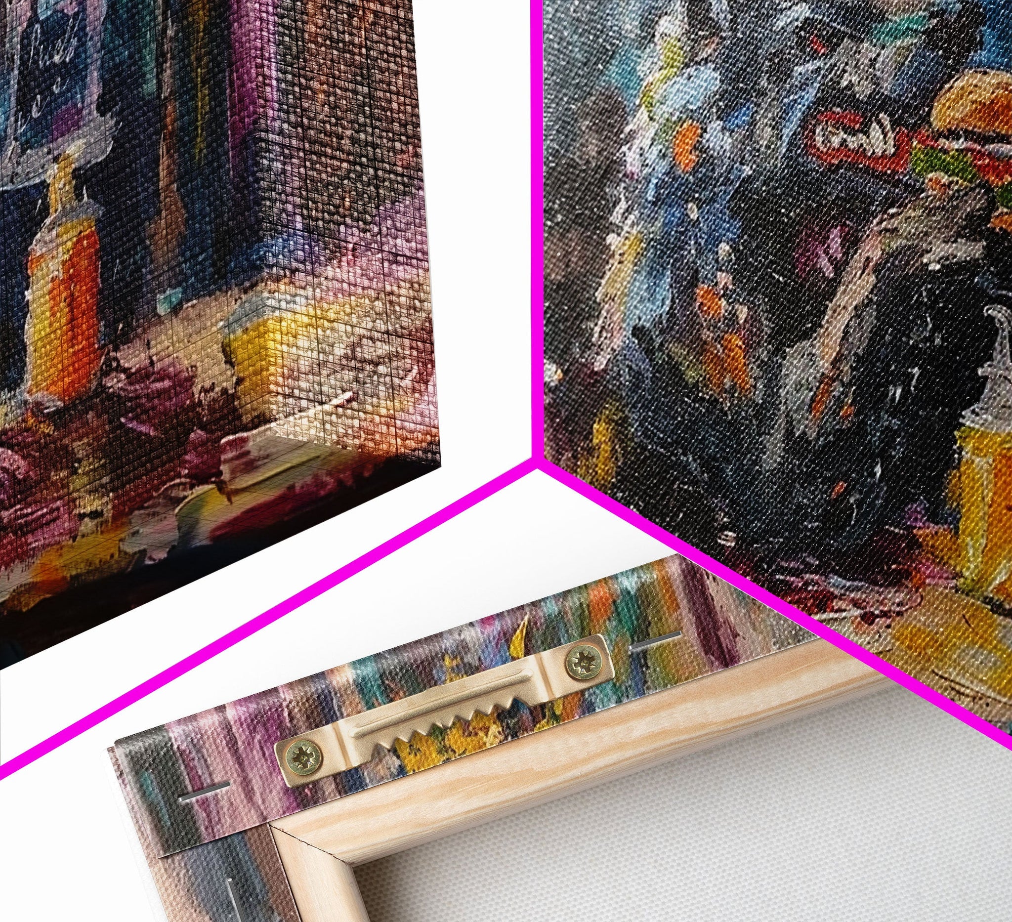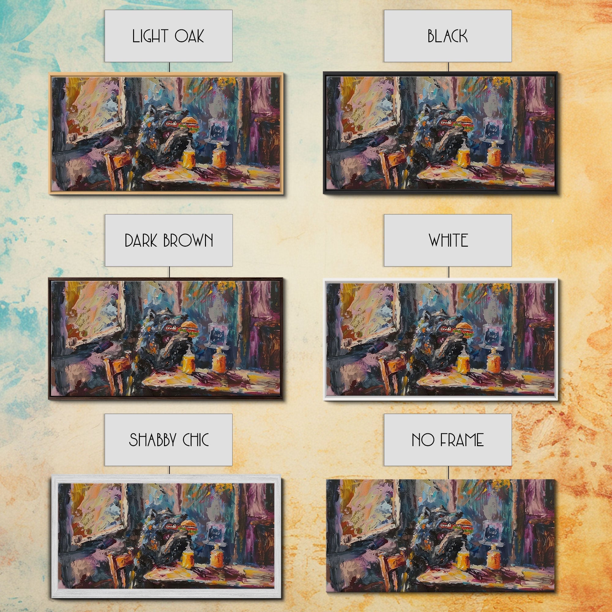 • Carregar imagem no visualizador da galeria, Funny Werewolf Having a Cheeseburger in a diner, framed canvas print, halloween decor