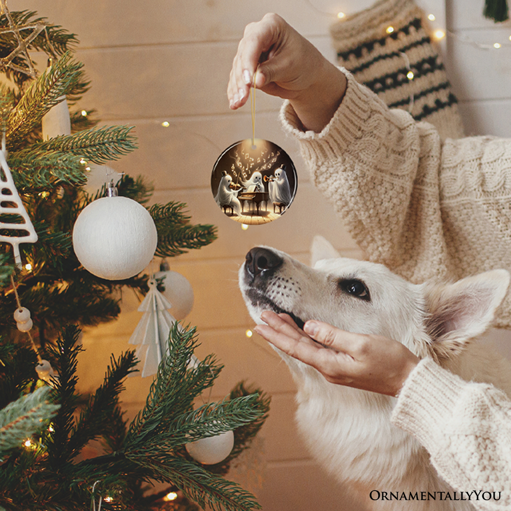Imagine a trio of ghostly maestros serenading your Halloween festivities from the branches of your bewitched tree. With a violinist in a top hat, a pianist, and a trumpeter, all shrouded in mystery and merriment, this ornament is the quirky heartthrob of eerie elegance. It's the conversation starter that dances between the whimsical and the nocturnal, a delight for both gothic glitz lovers and symphonic soul seekers. Hang it up and watch the room light up with an orchestra of gasps and giggles, because who doesn't want their holiday to be hauntingly harmonious? 🎩🎹🎺