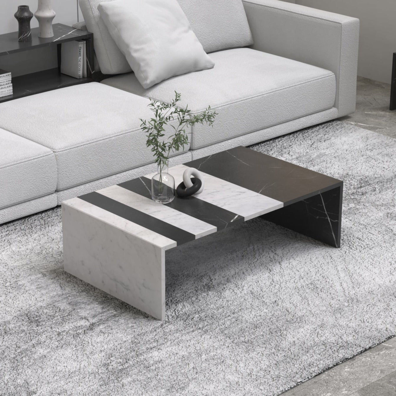 - Design: The combination of Carrara White and Pietra Grey marbles creates a visually striking contrast that adds depth and character to any space. The clean lines and sleek silhouette of the coffee table enhance its modern appeal, making it a centerpiece that demands attention.