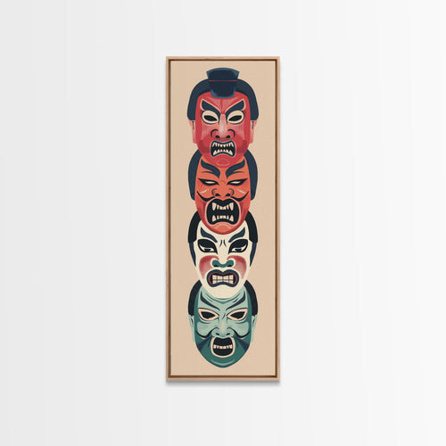 Bold Striking Japanese Kabuki Masks Vibrant Colors Depicted Traditional Style Tall Framed Canvas Print Cultural Home Decor