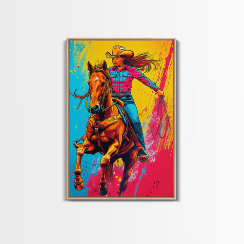 Bold Pop Art Cowgirl Riding Horse with Bright Colors - Framed Canvas Print, Equestrian Decor, Cowgirl Art for Bedroom, Living Room Wall Art
