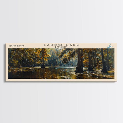 Caddo Lake Louisiana Framed Canvas Print, Pop Art Panoramic Travel Poster, Midcentury Modern, Wall Art, Scenic Nature Painting, Bedroom Decor