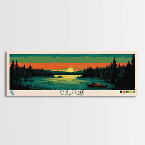 Candle Lake Saskatchewan Framed Canvas Print, Midcentury Modern Panoramic Wall Art, Living Room Decor, Pop Art, Travel Poster Art, Scenic Nature Painting