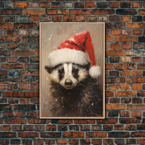 Cute Christmas Badger In A Santa Hat, Christmas Art, Christmas Decor, Christmas Wall Art, Christmas Painting, Vintage Christmas