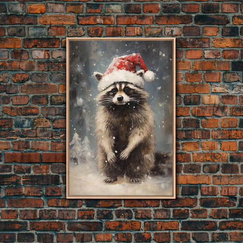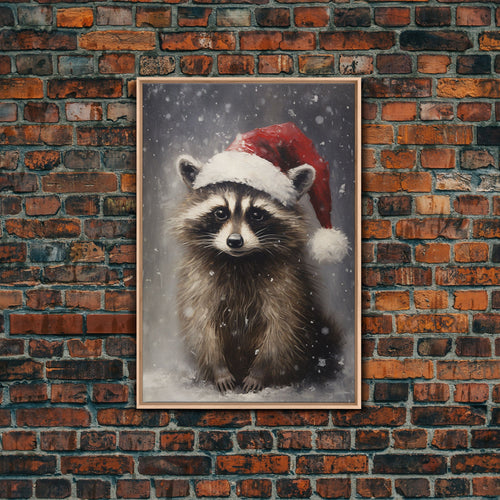 Cute Christmas Raccoon In A Santa Hat, Christmas Art, Christmas Decor, Christmas Wall Art, Farmhouse Christmas, Vintage Christmas Raccoon
