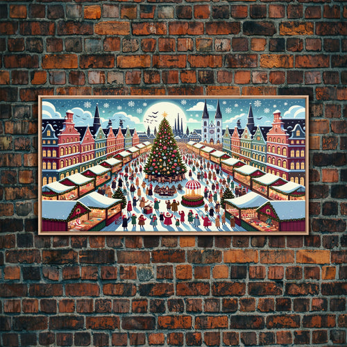 Abstract Christmas Village Centerpiece Wall Art - Framed Canvas Print - Winter Wonderland Decorated for Christmas Canvas Wall Art - Vintage