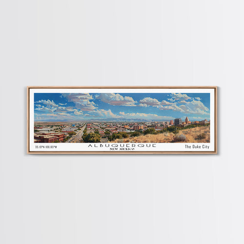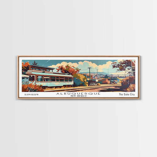 Albuquerque New Mexico Panoramic Painting, Framed Canvas Print, Mid Century Modern Wall Art, Retro Pop Art Travel Poster, Office Decor, City Art