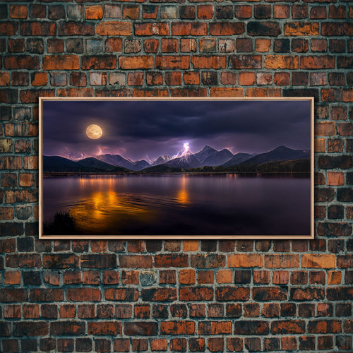 Full moon canvas print, Lightning storm over a mountain lake at night, cool wall art, awesome wall art