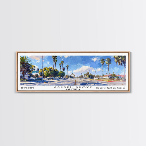 Garden Grove California Panoramic Painting, Framed Canvas Print, Mid Century Modern Wall Art, Retro Pop Art Travel Poster, Living Room Decor, City Art
