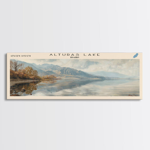 Alturas Lake Idaho Framed Canvas Print, Panoramic Wall Art, Midcentury Modern, Pop Art, Travel Poster, Lake House Decor
