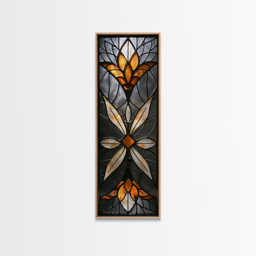 Amber and White Stained Glass Floral Design - Framed Canvas Print, Midcentury Modern Art, Skinny Art, Tall Art, Living Room Wall Decor, Boho Art