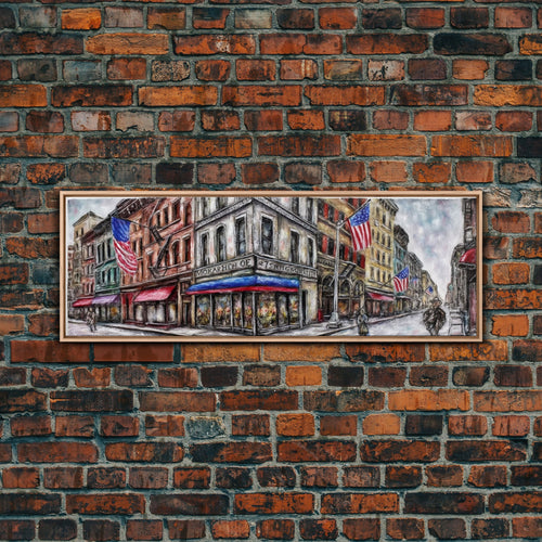 • American Flags Vintage Canvas Print, Pastel Art, Large Urban Art Print, Colorful Buildings Wall Decor, Panoramic, Wall Art, Canvas Print