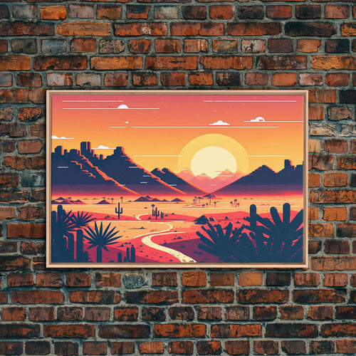 Art Deco Style Desert Landscape Art, Framed Canvas Print, Unique Colorful Wall Decor, Pueblo Style Midwestern Decor, Western Theme Art