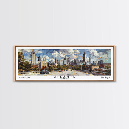 • Atlanta Georgia Panoramic Painting, Mid Century Modern Framed Canvas Print, Retro Pop Art Travel Poster, Wall Decor, Gift Idea, Home Decor