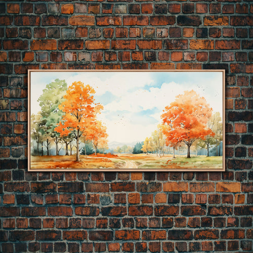 Autumn in the forest, orange and red leaves, framed canvas print, watercolor painting print on canvas, colorful wall art