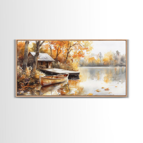 Autumn lakeside cabin decor Canvas Print fall colors cabin and canoe moody landscape rustic seasonal wall art autumn home decor gift idea
