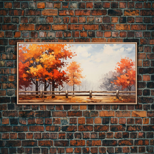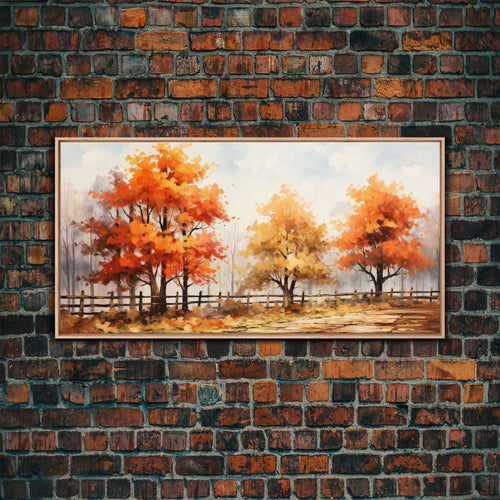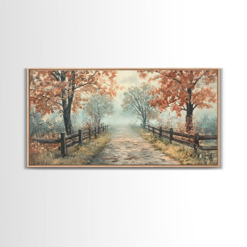 Autumn Path Framed Canvas Print, Rustic Fence and Trees Wall Art, Farmhouse Fall Home Decor, Vintage Style Wall Art, Seasonal Gift Idea