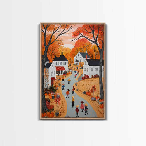 Autumn Village Scene Framed Canvas Print Tall Art With Fall Leaves And Pumpkins, Cozy Wall Art For Seasonal Farmhouse Decor