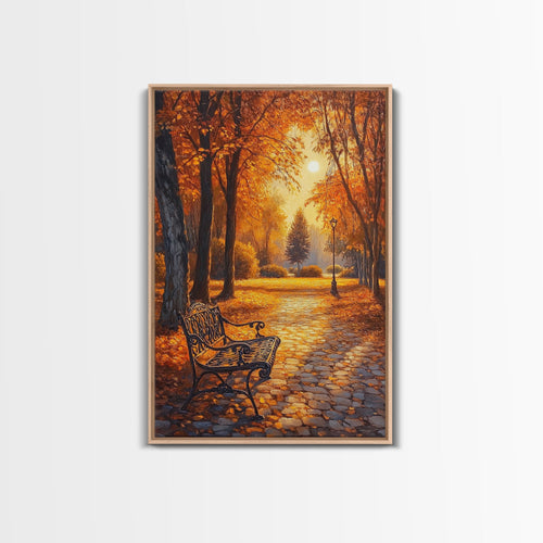 Autumn Path Bench Framed Canvas Print, Serene Fall Landscape Wall Art, Cozy Farmhouse Decor, Seasonal Wall Art Gift Idea