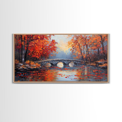 Autumn River Bridge Framed Canvas Print, Colorful Fall Landscape Wall Art, Cozy Seasonal Decor, Best Gift Idea for Farmhouse Wall Art