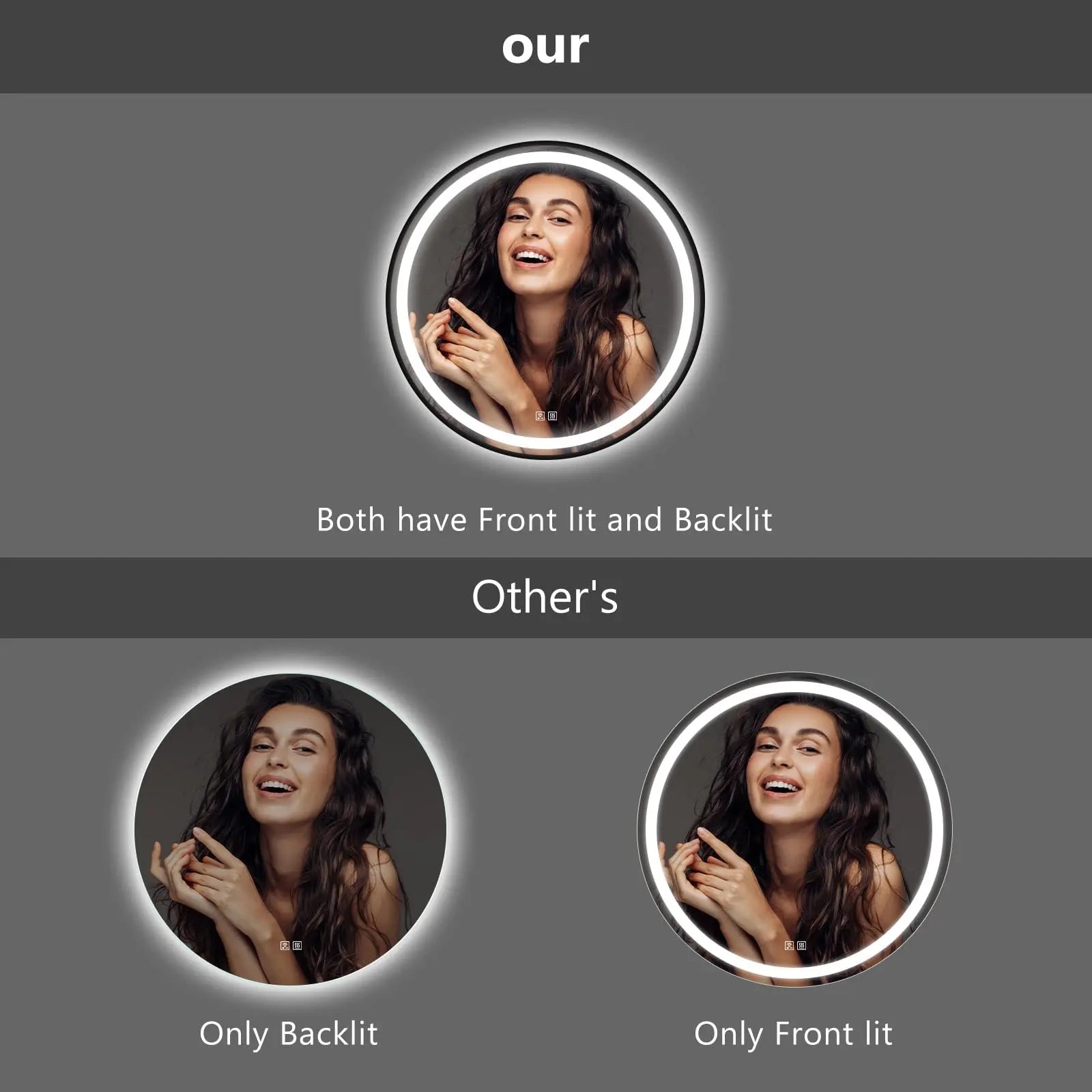 No more worries about dim bathroom light.Featuring dual built-in LED light bars with grace,This mirror provides double the luminous embrace.Bid farewell to shadows, ensuring flawlessness,For makeup, shaving, and beauty with finesse.