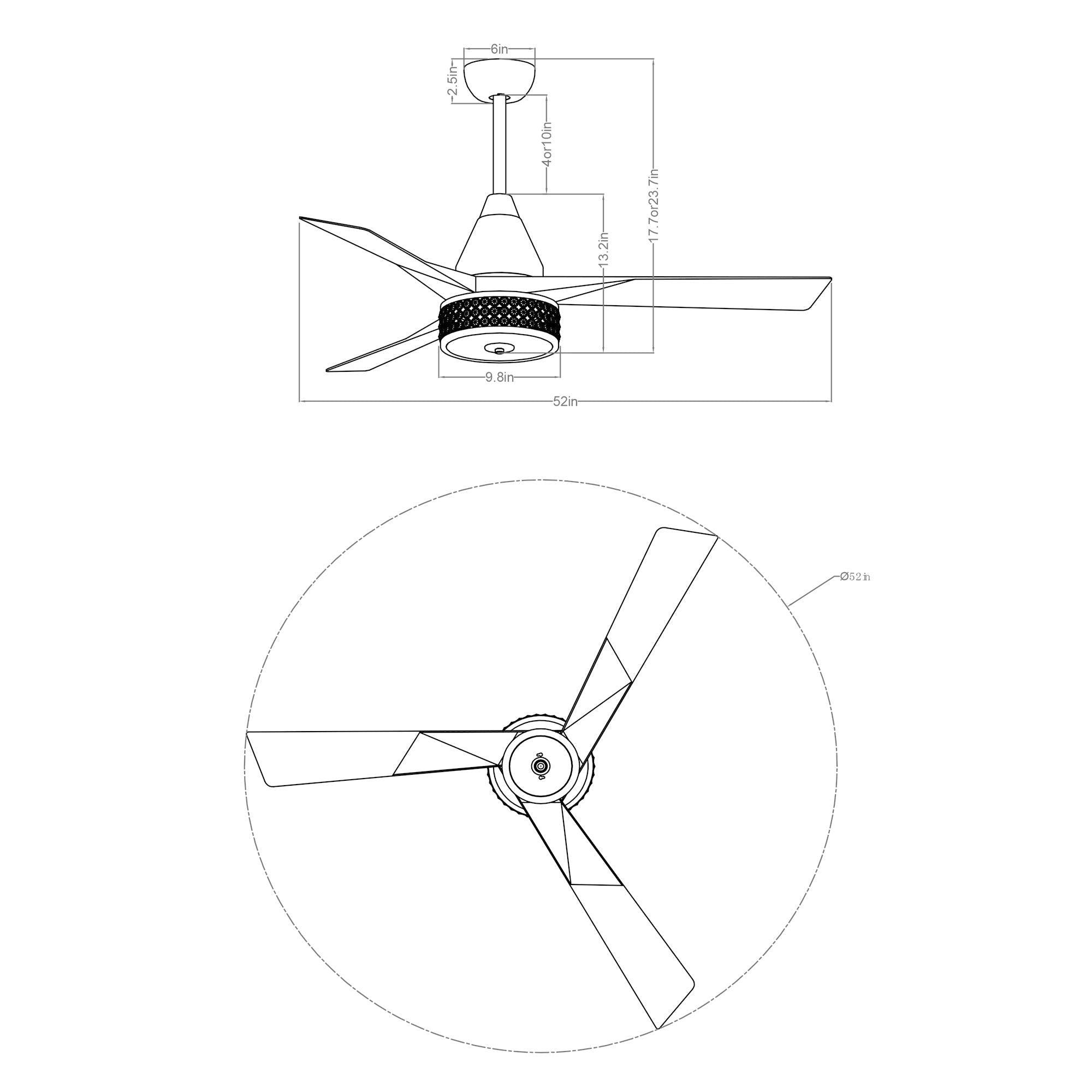 52" | Iron, Solid wood, and Crystal | L4"&L10" | 3*solid wood Blades | LED | 3000/4000/6000K | AC motor | Remote control | 3 | Dry location |