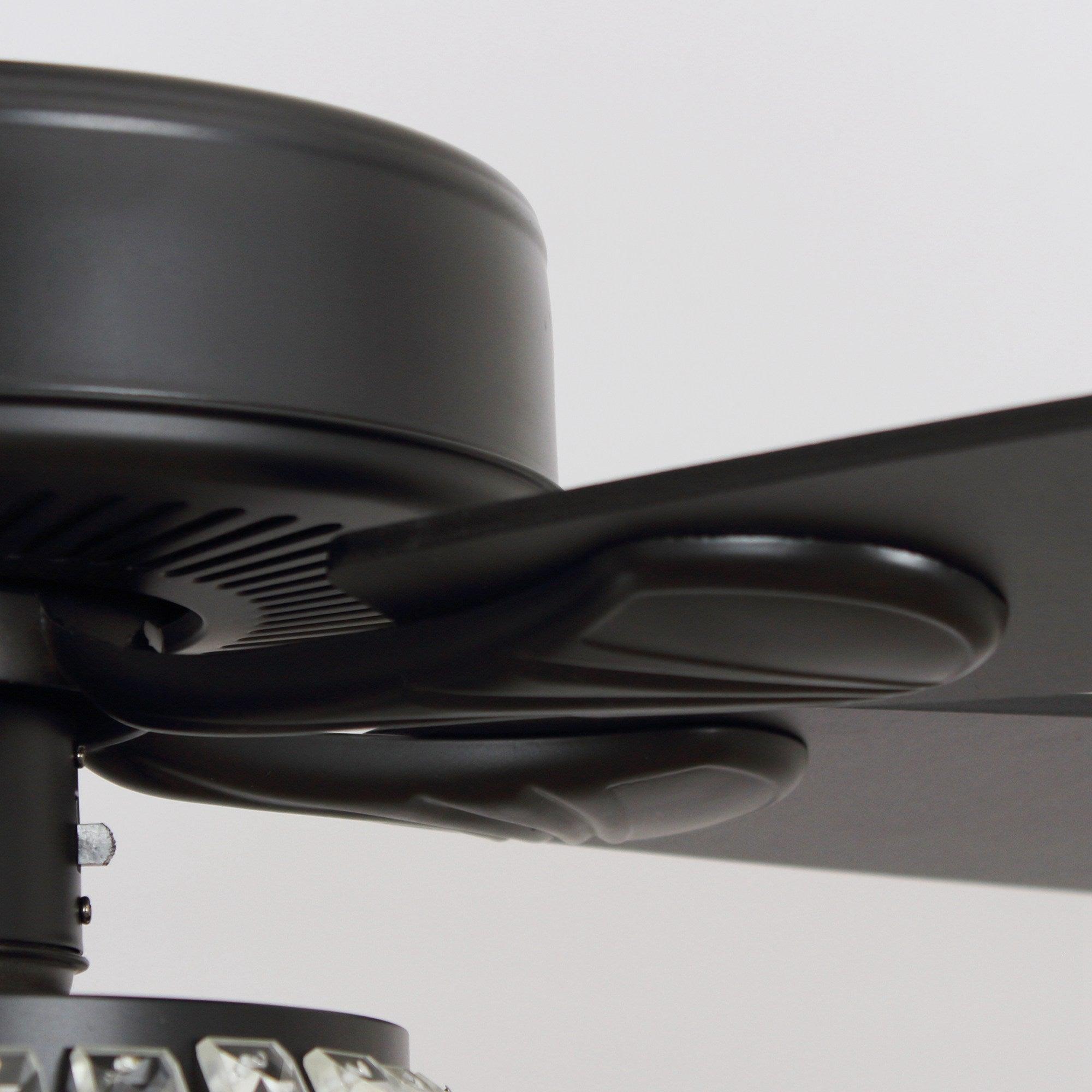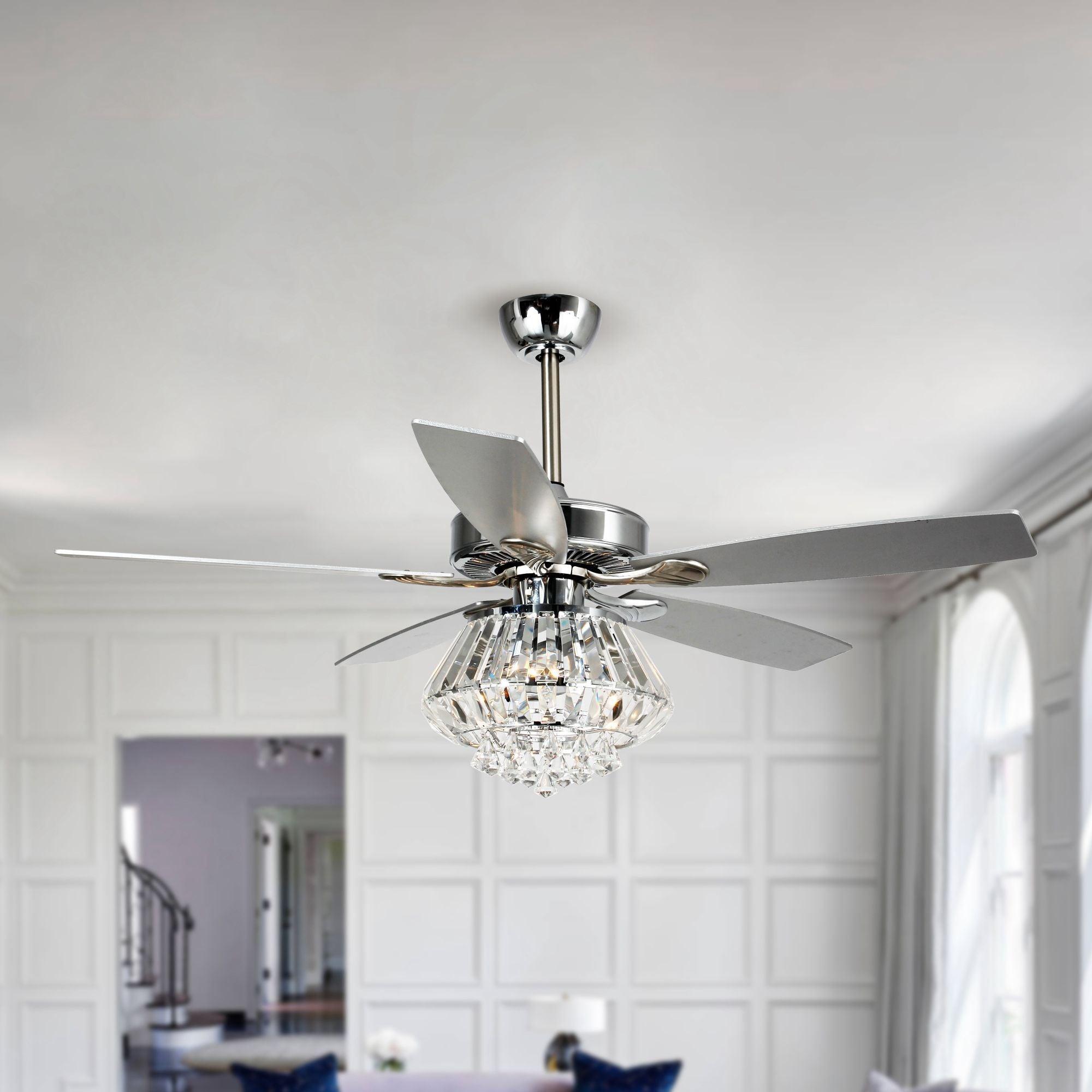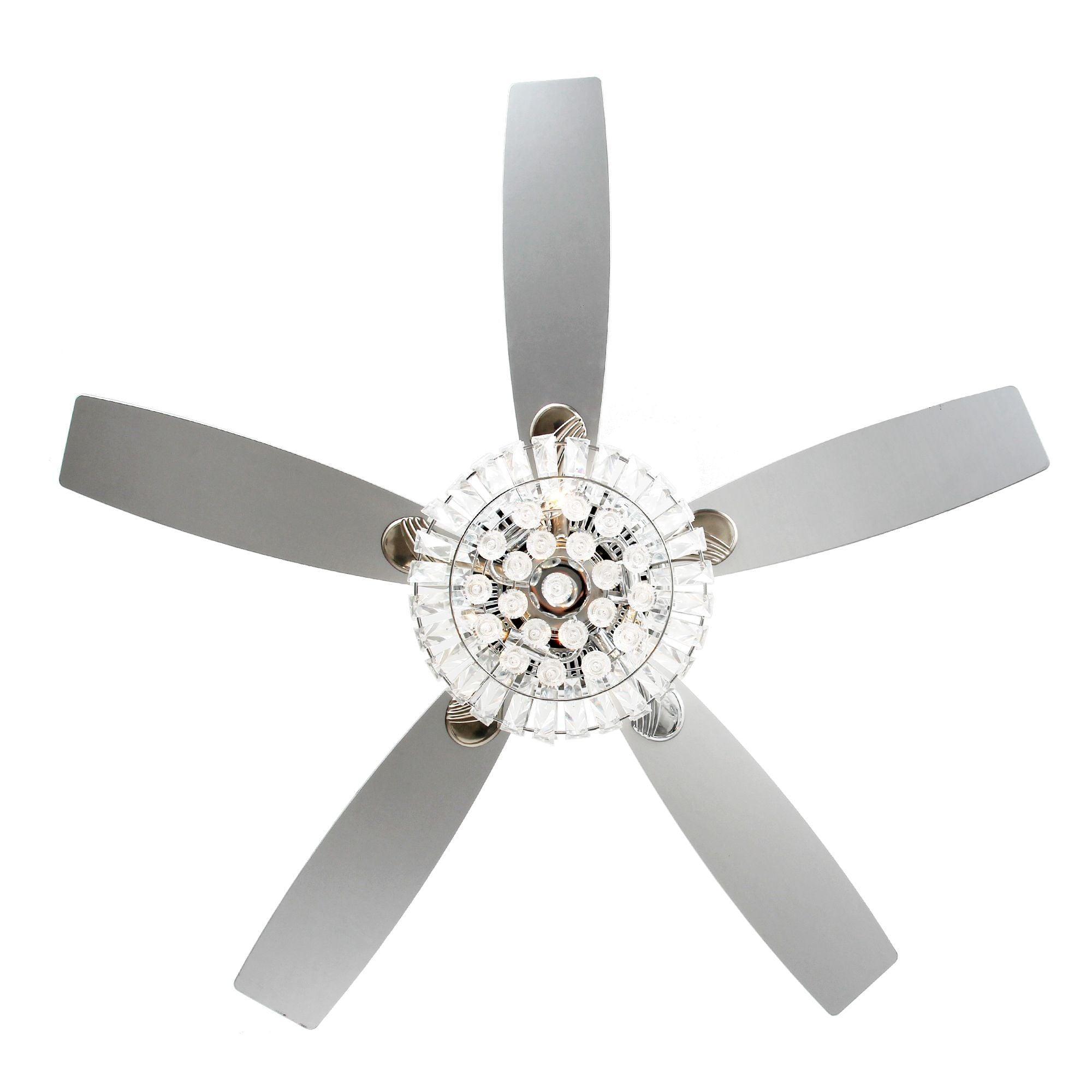 These crystal chandelier ceiling fans with lights are the most cost-efficient option for bringing the temperature down and moving stale air out of your room. This lighted chandelier ceiling fan is the perfect solution for your cooling and lighting needs. A full crystal shade combines to fill your home with a grandeur rarely found in such a functional package. The matching silver-stained wooden blades move an impressive amount of air. The 3-speed motor ensures you find the exact setting for your stimulating comfort.