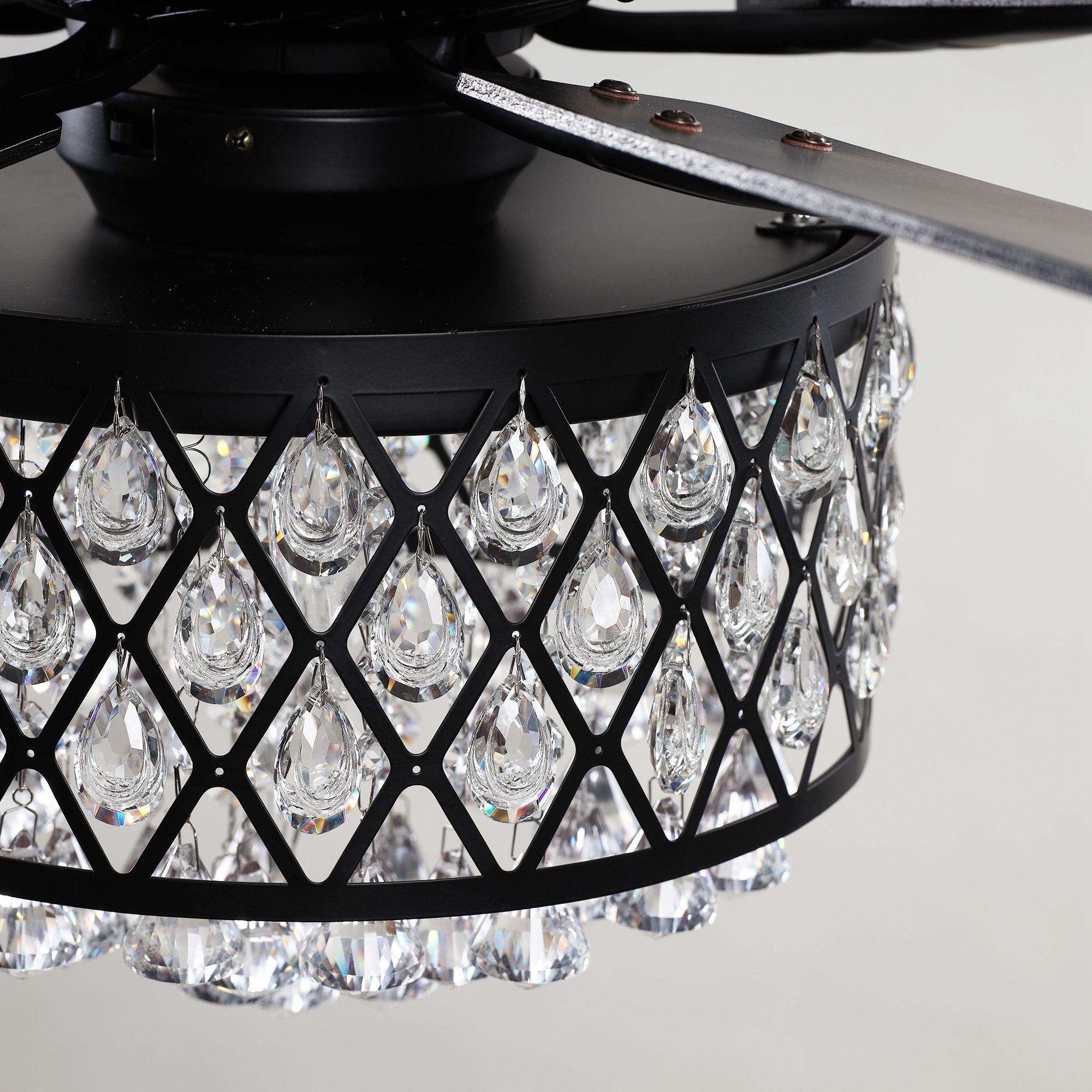 This mastery black crystal chandelier ceiling fan with light is the most cost-efficient option for bringing the temperature down and moving stale air out of your room. This lighted chandelier ceiling fan is the perfect solution for your cooling and lighting needs. A full crystal shade combines to fill your home with a grandeur rarely found in such a functional package. The matching black finish wooden blades move an impressive amount of air. The 3-speed motor ensures you find the exact setting for your stimulating comfort.